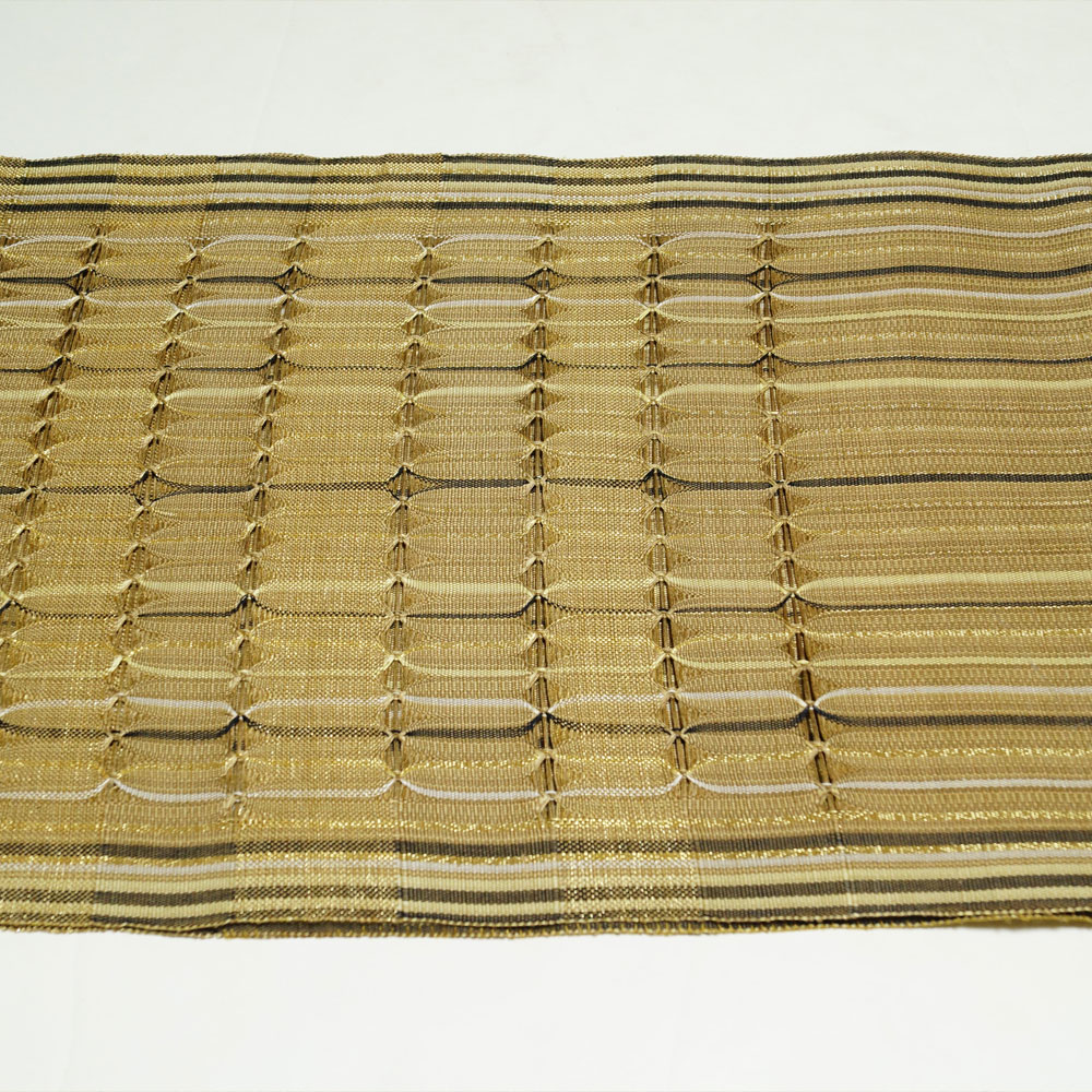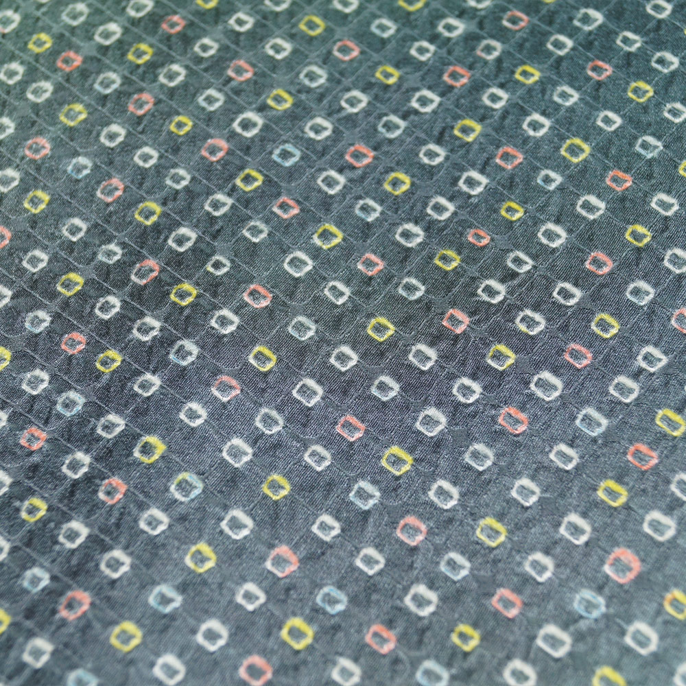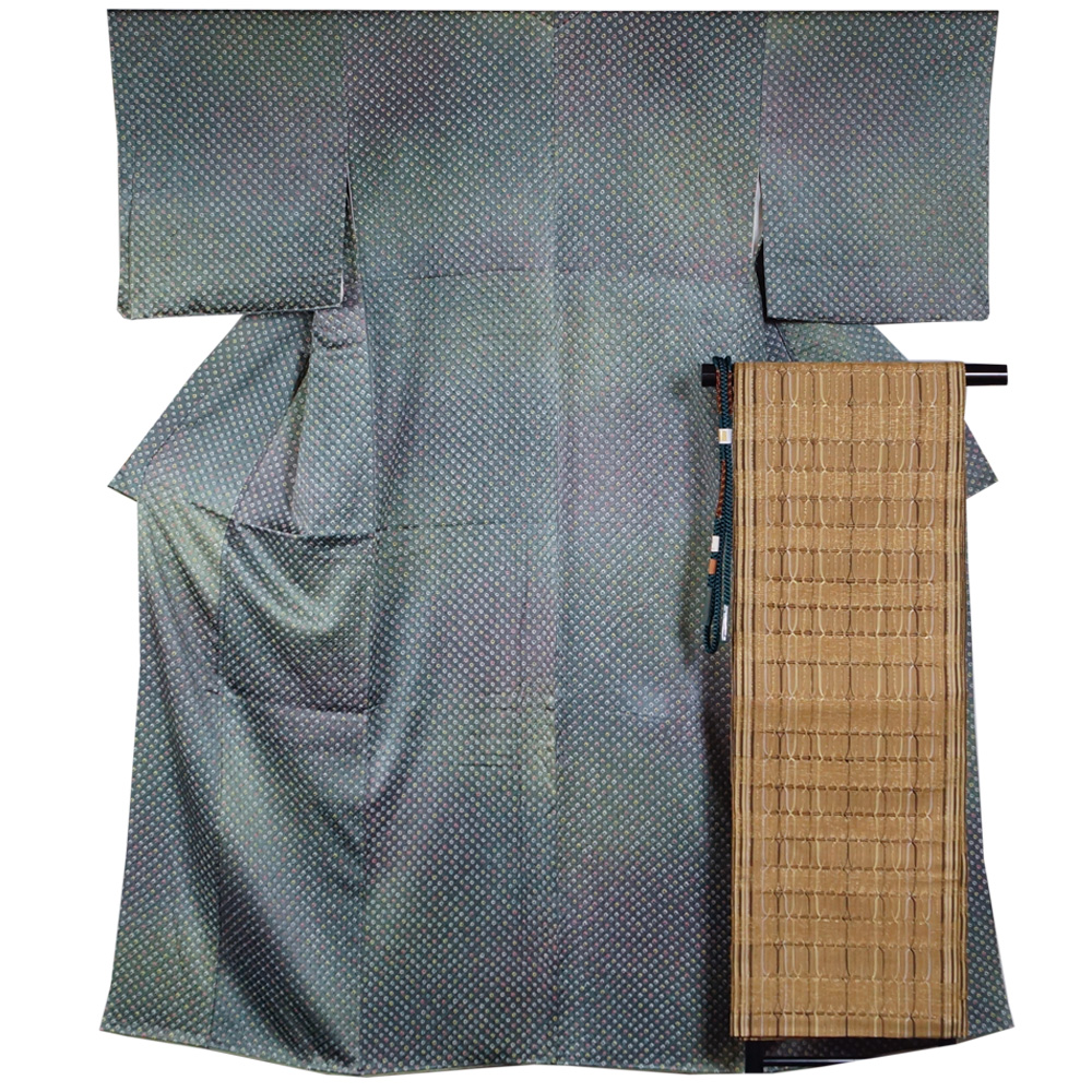 | 商品 説明 | 菱模様の地織が施された千草色系ぼかしの綸子地に、パステルカラーの匹田絞り染めが施された小紋と、カーキ色系の地に金・黒・白色系の縞に変わり透かし織が施された八寸名古屋帯、紺鼠色系の丸組の帯締めの3点セットです。 |