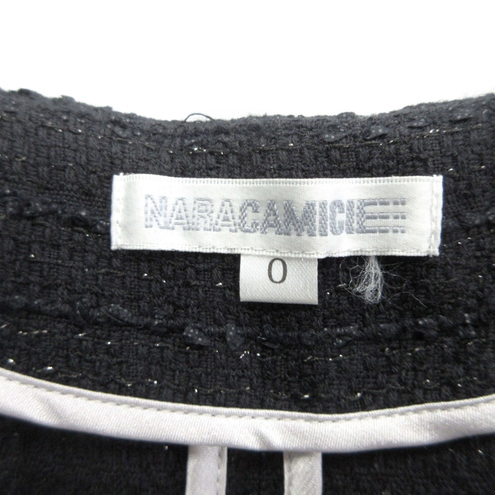 美品 NARA CAMICIE ナラカミーチェ ツイード ノーカラー ジャケット ブレザー フリンジ 肩パッド セレモニー SIZE0 黒 ブラック