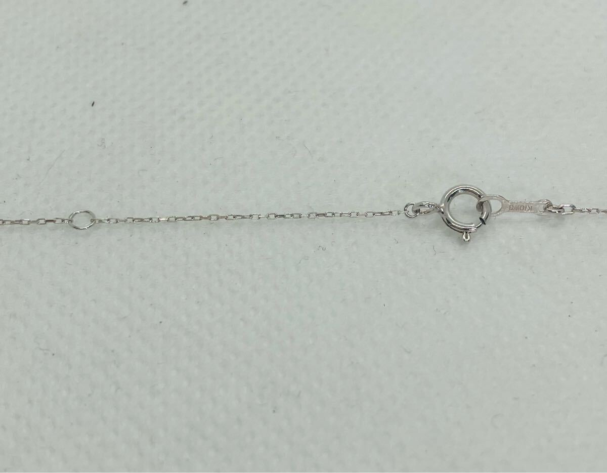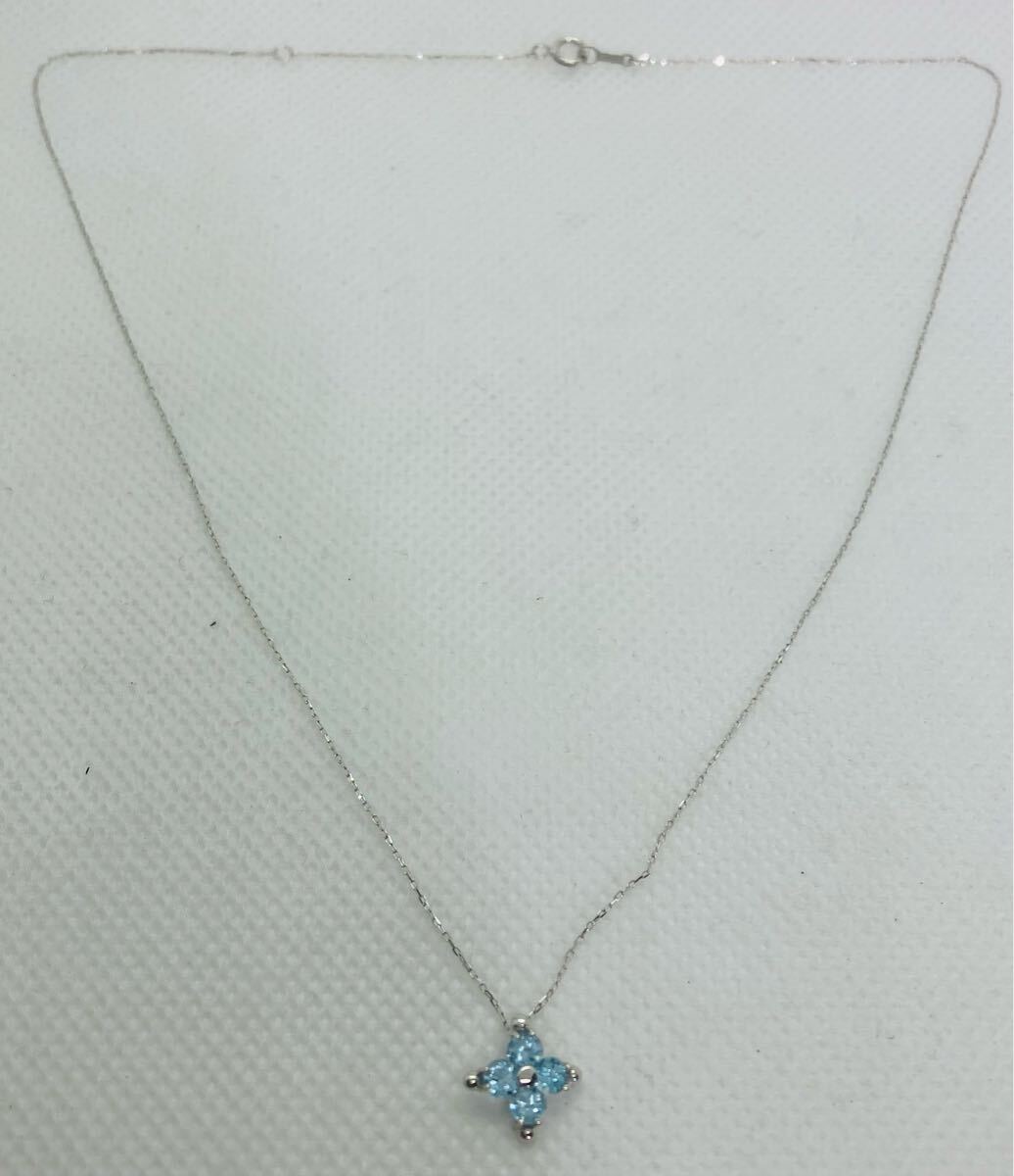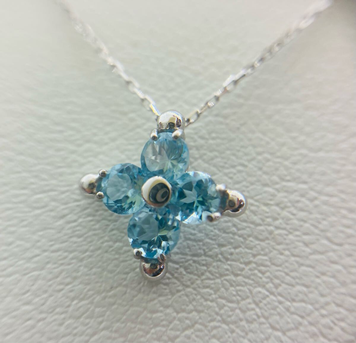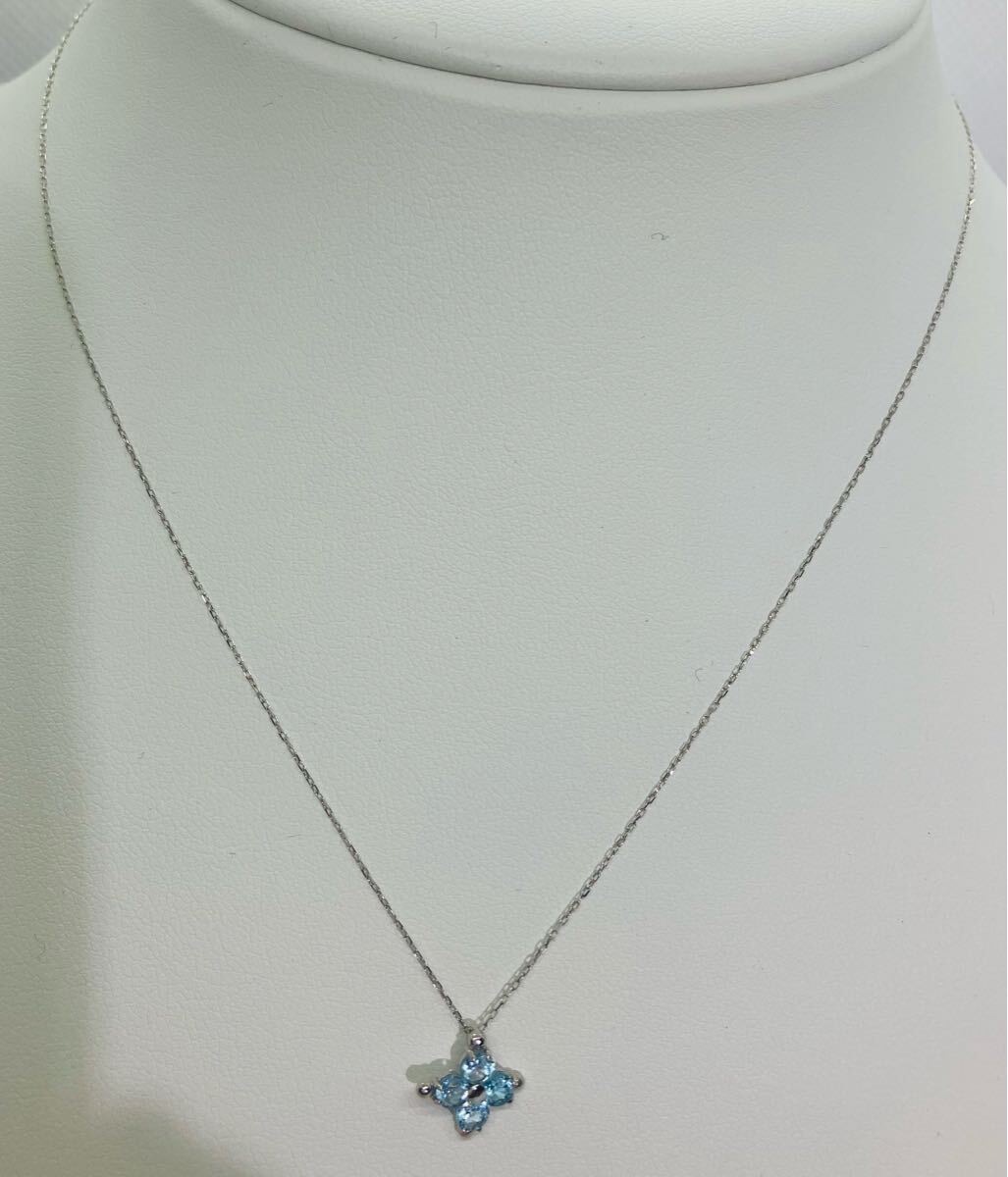 ブルートパーズ、ラウンド3.0ミリ直径を4ピース使用したペンダント、k10ホワイトゴールド製でチェーンは丸小豆、40センチに37センチでもお使い頂けますアジャスターカン付きです。重量は、0.77グラムとなります。