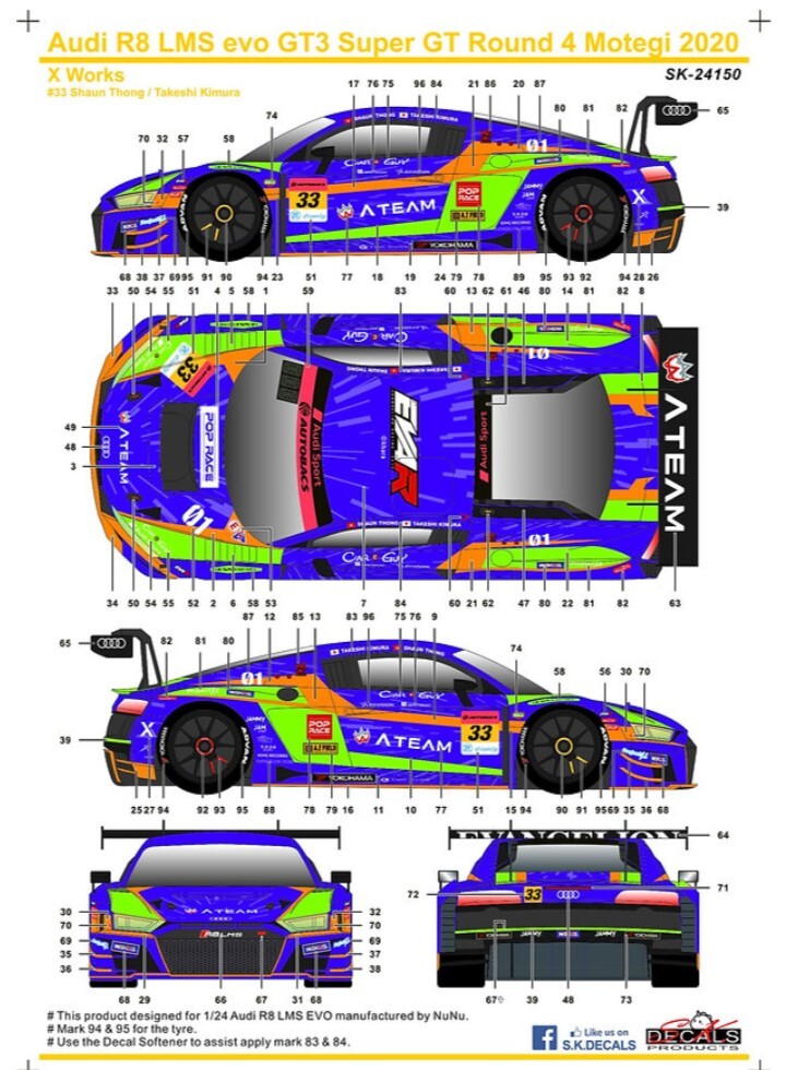 即決 デカール NUNU プラッツ対応 1/24 アウディ Audi R8 LMS Evo GT3 Super GT Round 4 Motegi 2020 送料無料