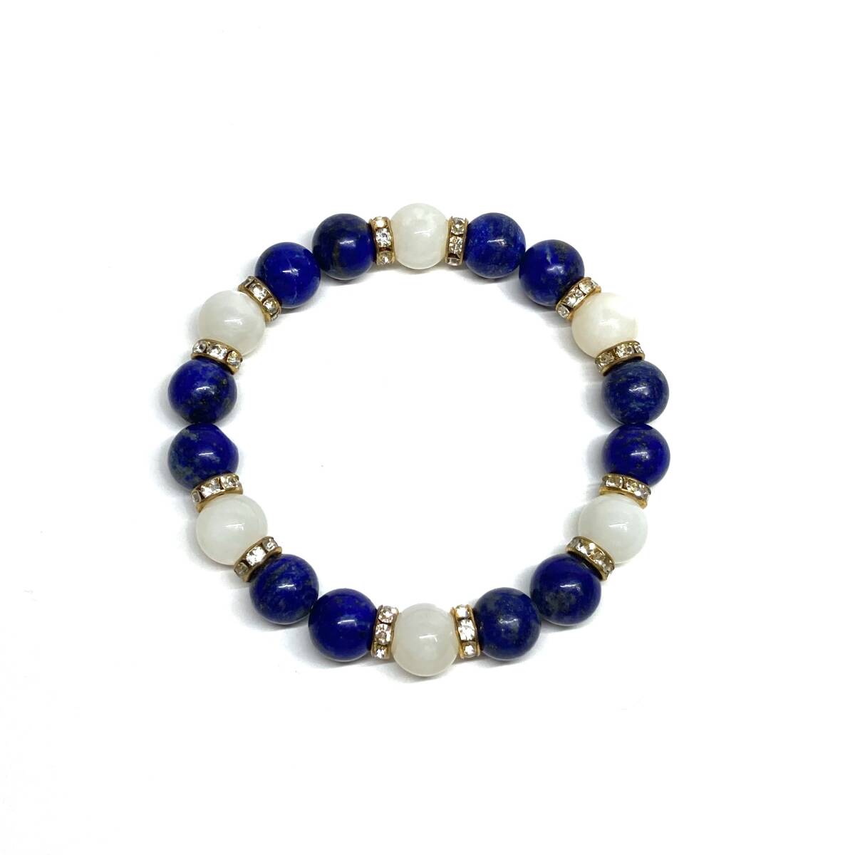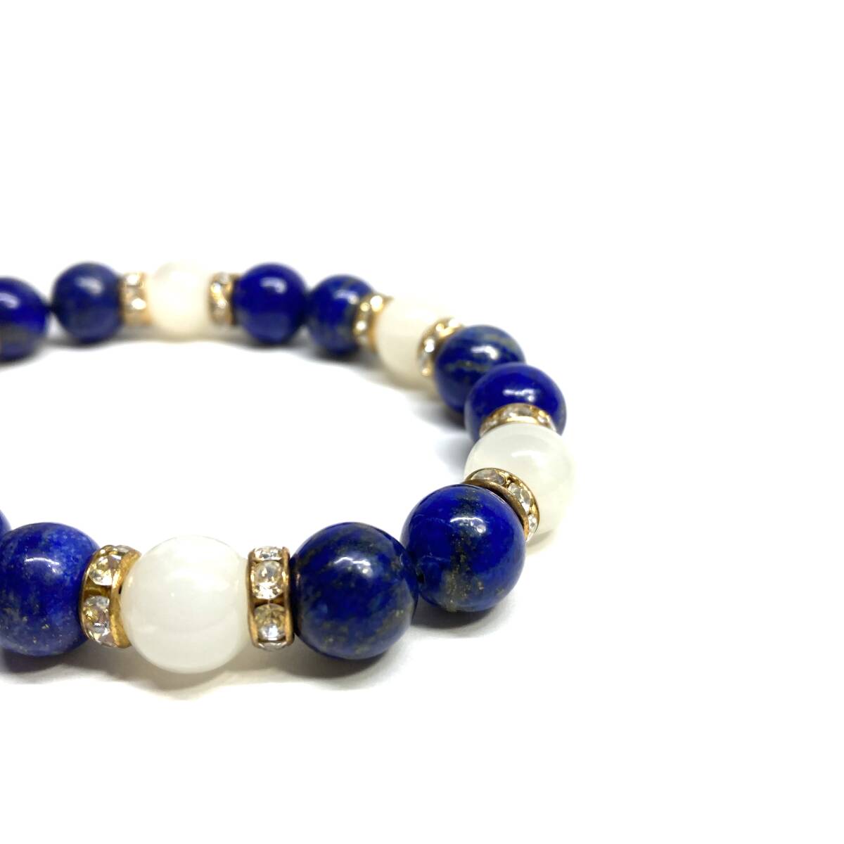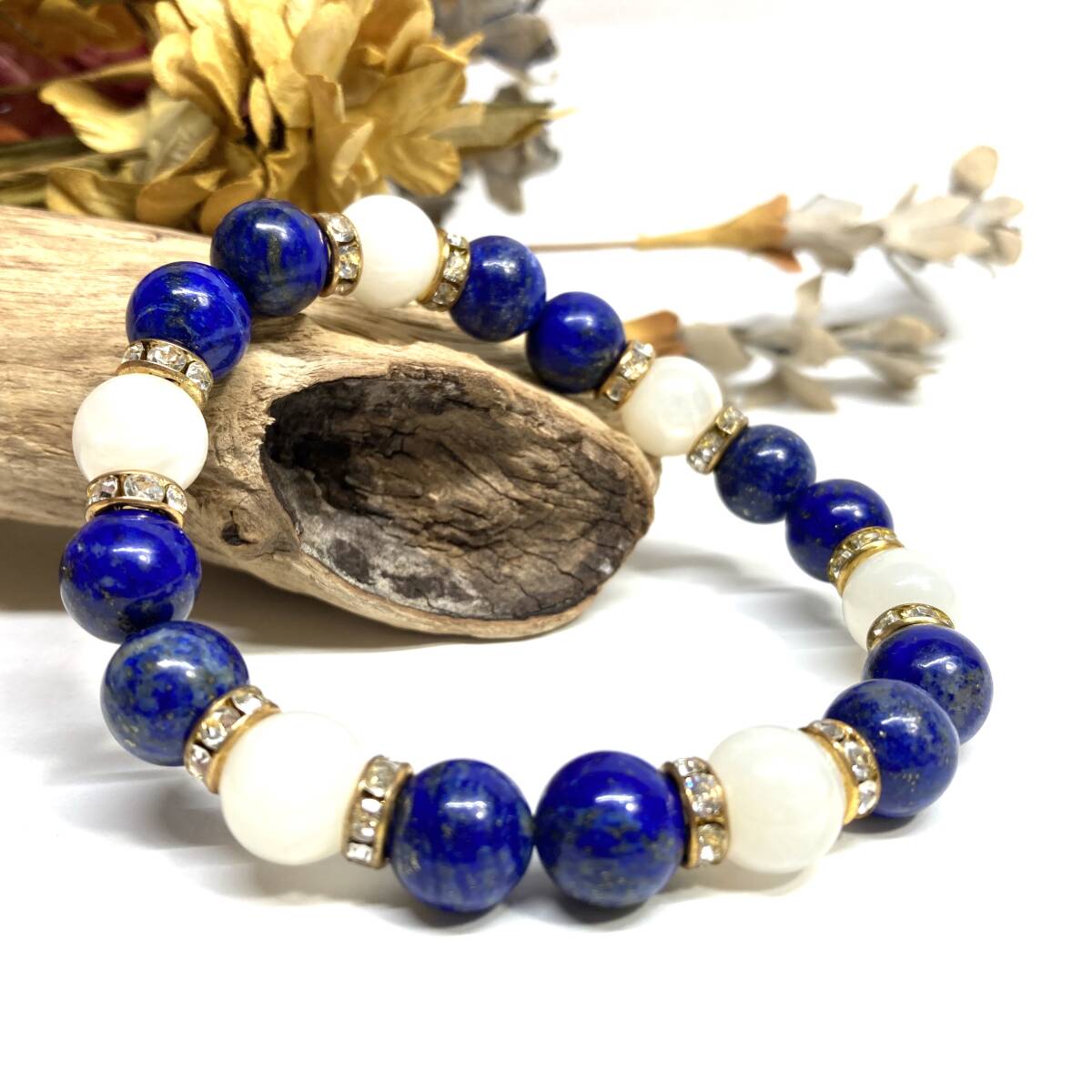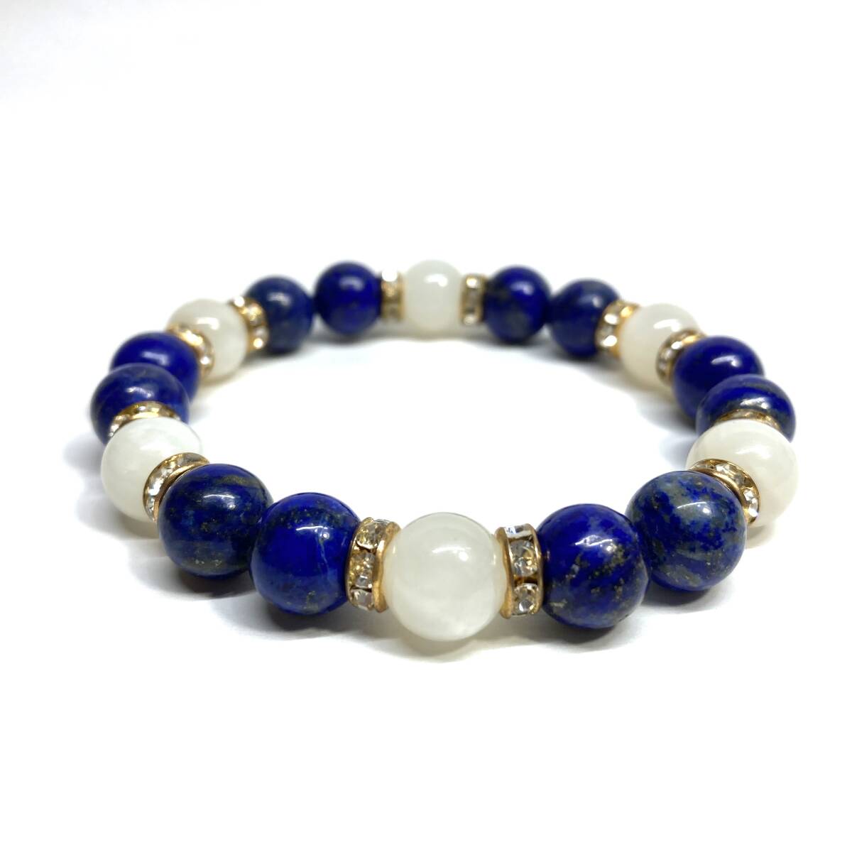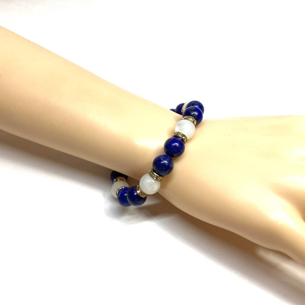 こちらは、ラピスラズリとムーンストーンを組み合わせたパワーストーンブレスレットです。間にはロンデルを挟み高級感あるデザインに仕上げております。石大きさは腕にも馴染みやすいように10mm玉で内径約18cm(伸可能)です。(サイズ変更の場合は取引ナビにてご連絡をお願いします。) 数に限りがございますので気になる方はお早めにどうぞ。