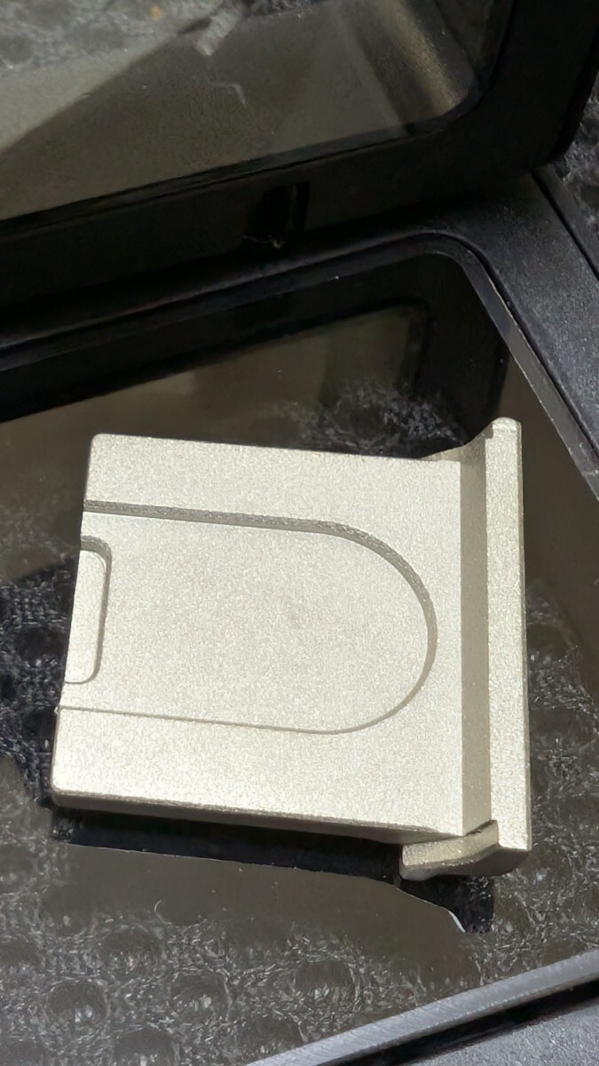 素材はおそらくステンレス、表面にサンドブラスト処理+ヘアライン仕上げ且つキレイに切削した彫り込みには艶消し黒塗装と至れり尽くせりです。