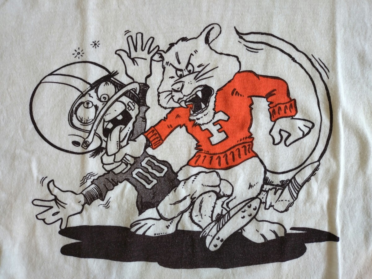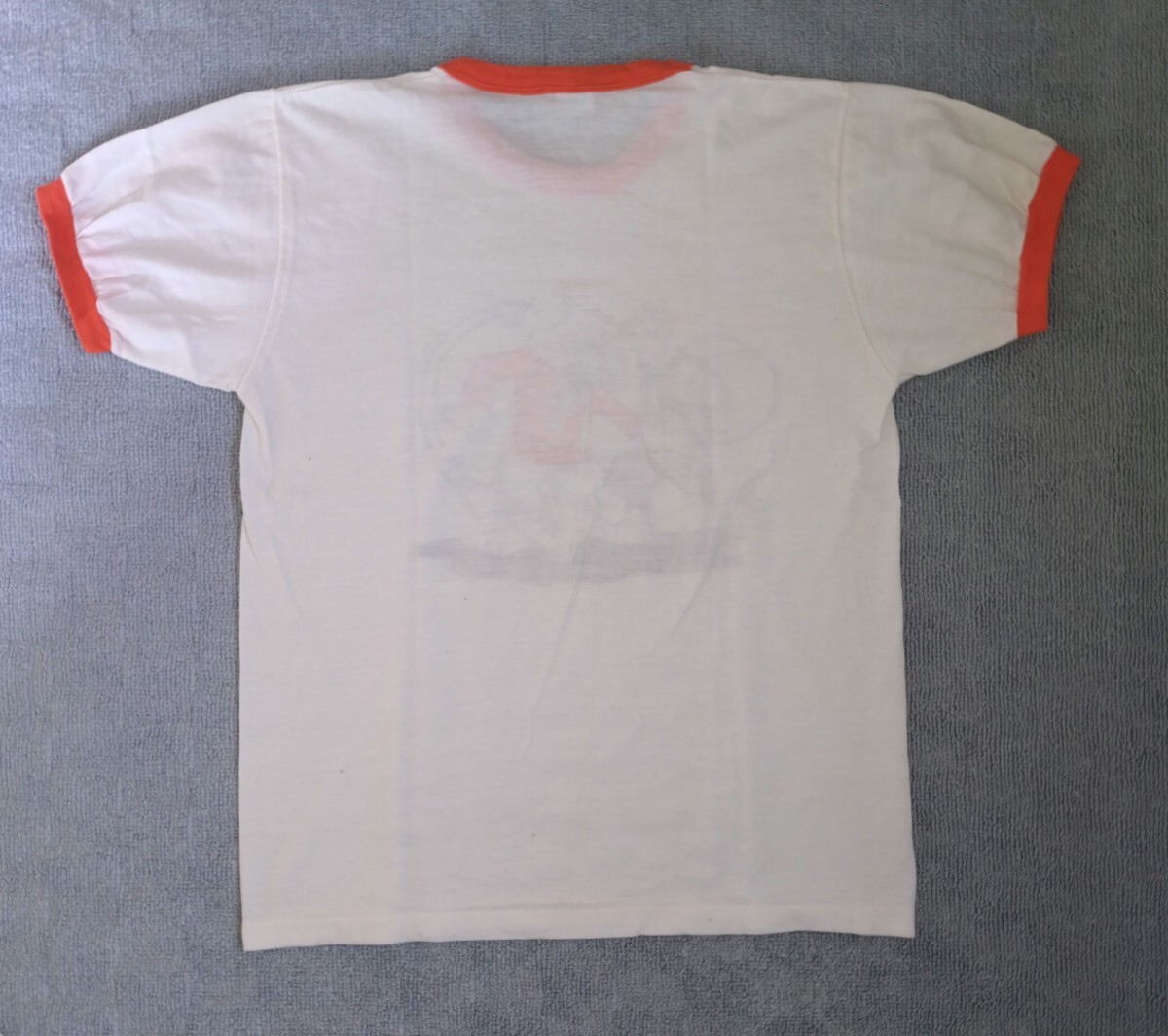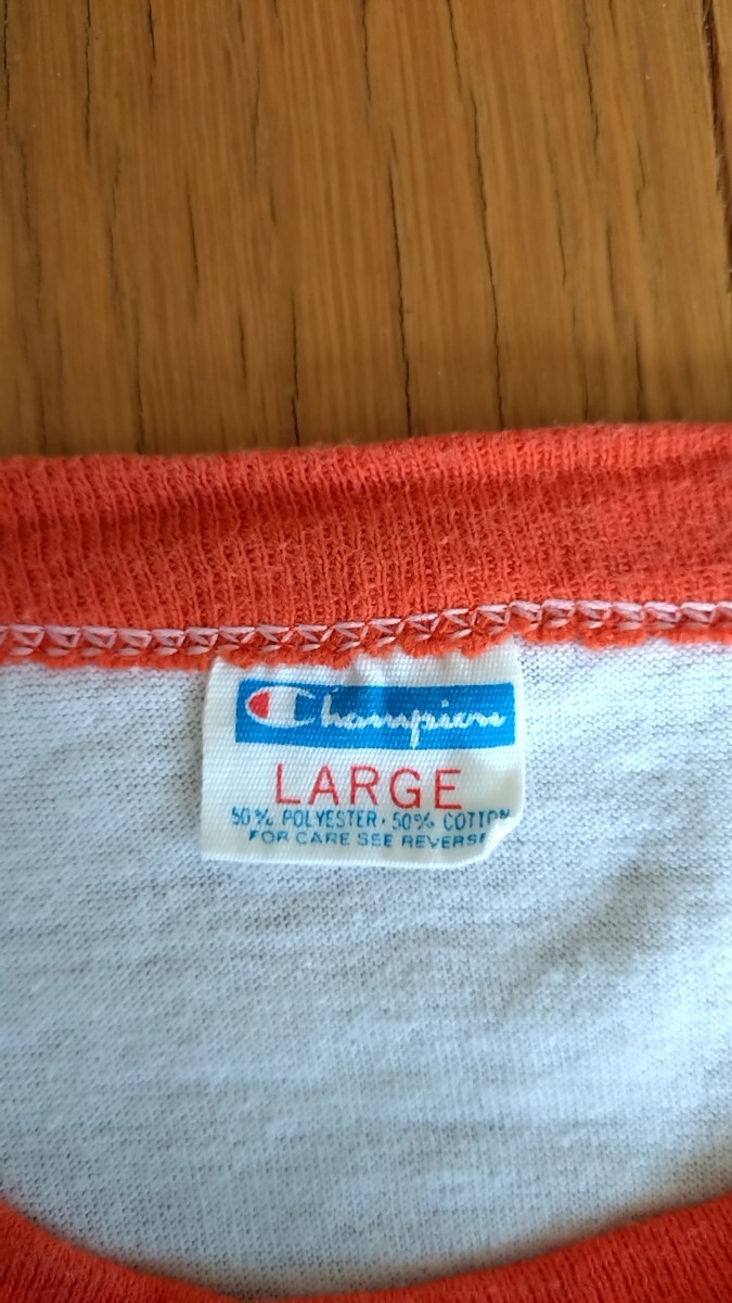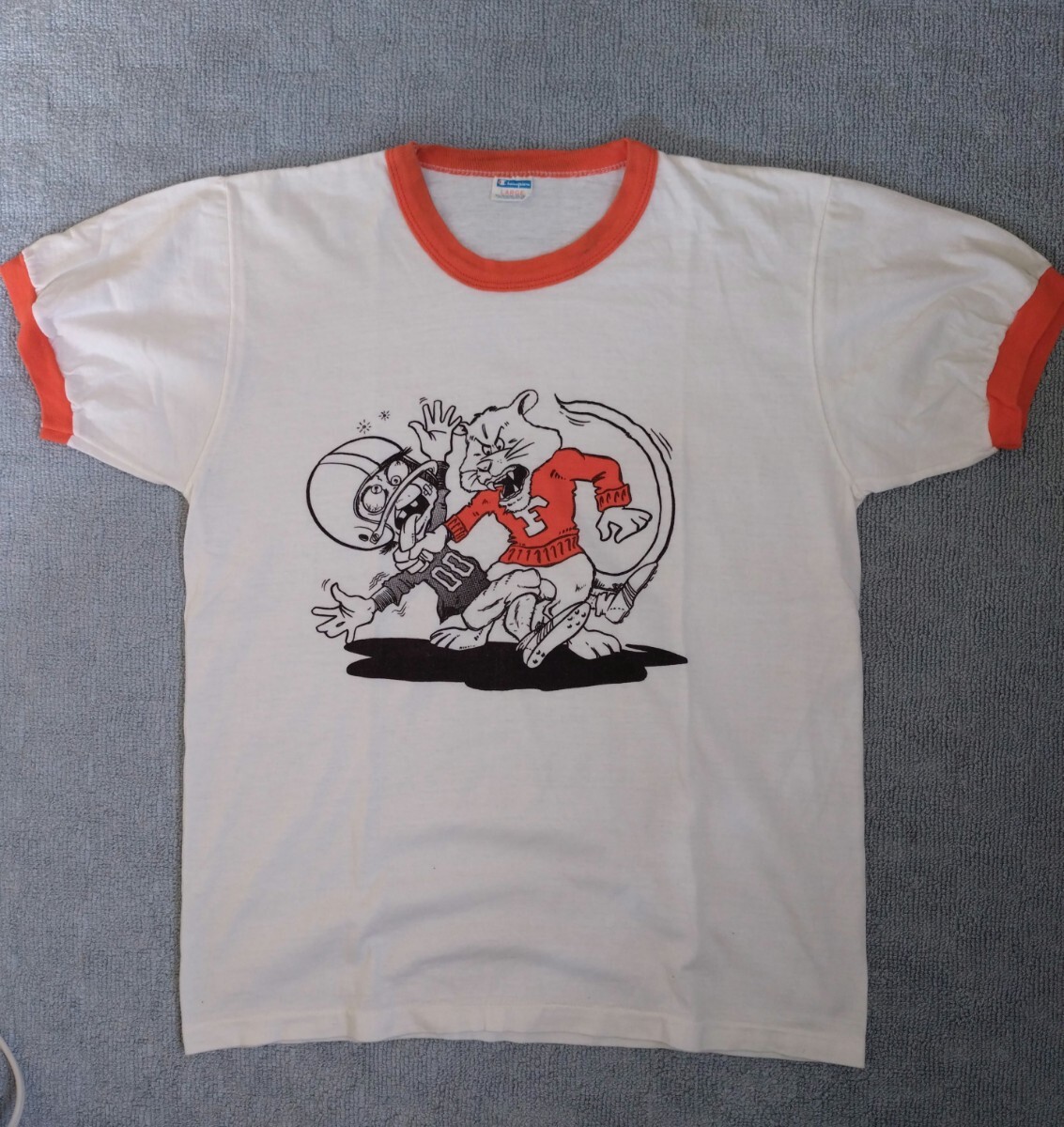 Championのバータグ70'sのカレッジキャラクター染み込みプリントリンガーTシャツです。