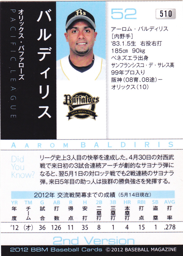BBMベースボールカード 2012-2nd 510 アーロム・バルディリス オリックス・バファローズ ベネズエラ