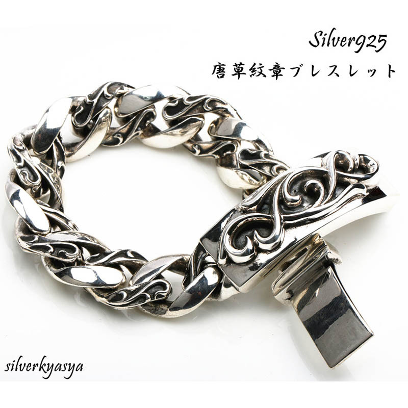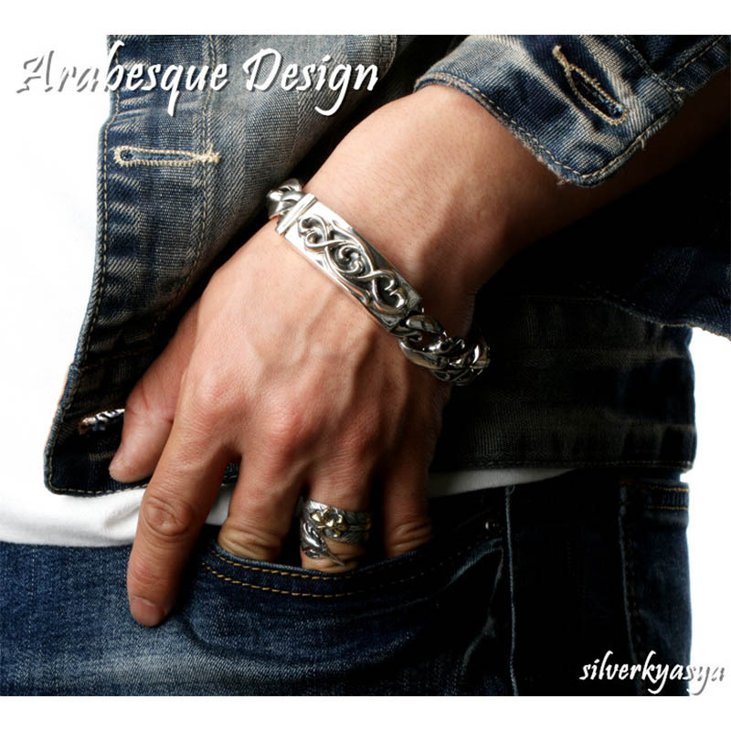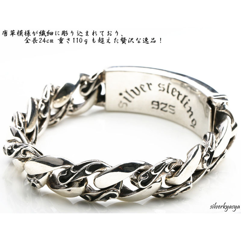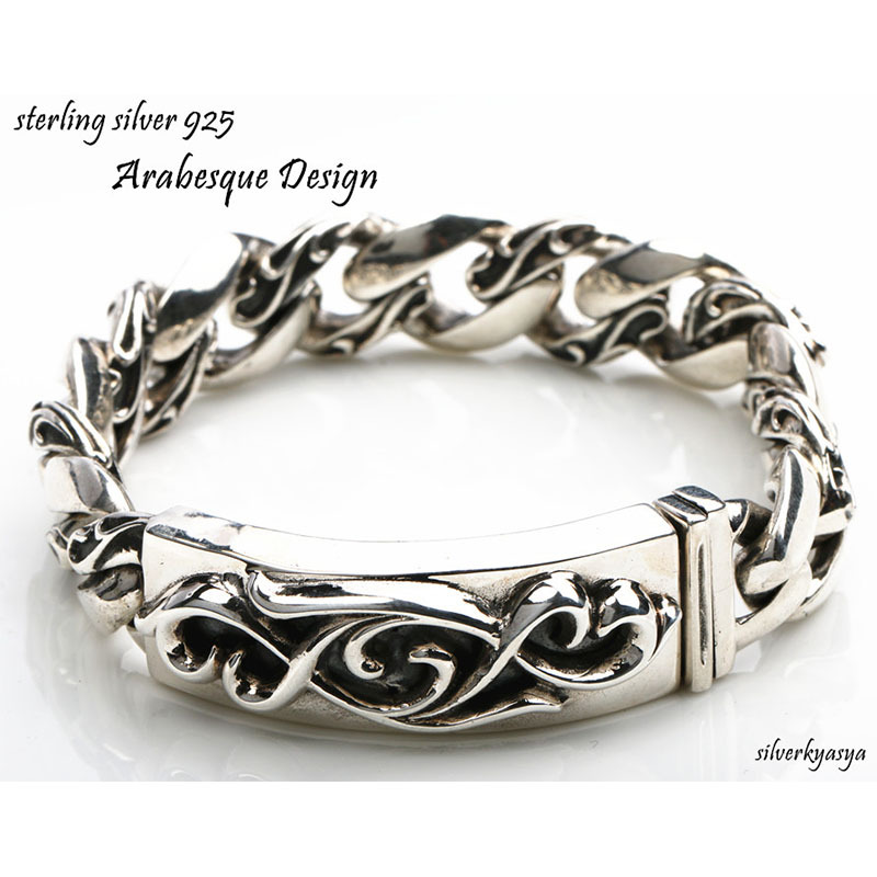 | 商品概要 | ■ITEM DETAIL シルバー925素材、アラベスク(唐草)デザインのIDブレスレット。細部まで丁寧に仕上げており、唐草の美しさが十分に表現された逸品で、重量は100gも超えしっかりとした厚みで腕元を飾ります。 ■SILVER925素材 シルバー925は、銀含有率(純度)92.5%を示し、一般的に純銀として扱われています。サビや劣化等がほとんどなく金属アレルギーも出にくいとされており、アクセサリーとして重宝される金属です。 |