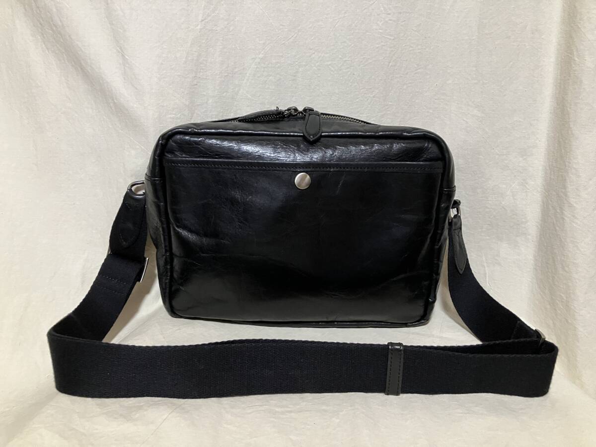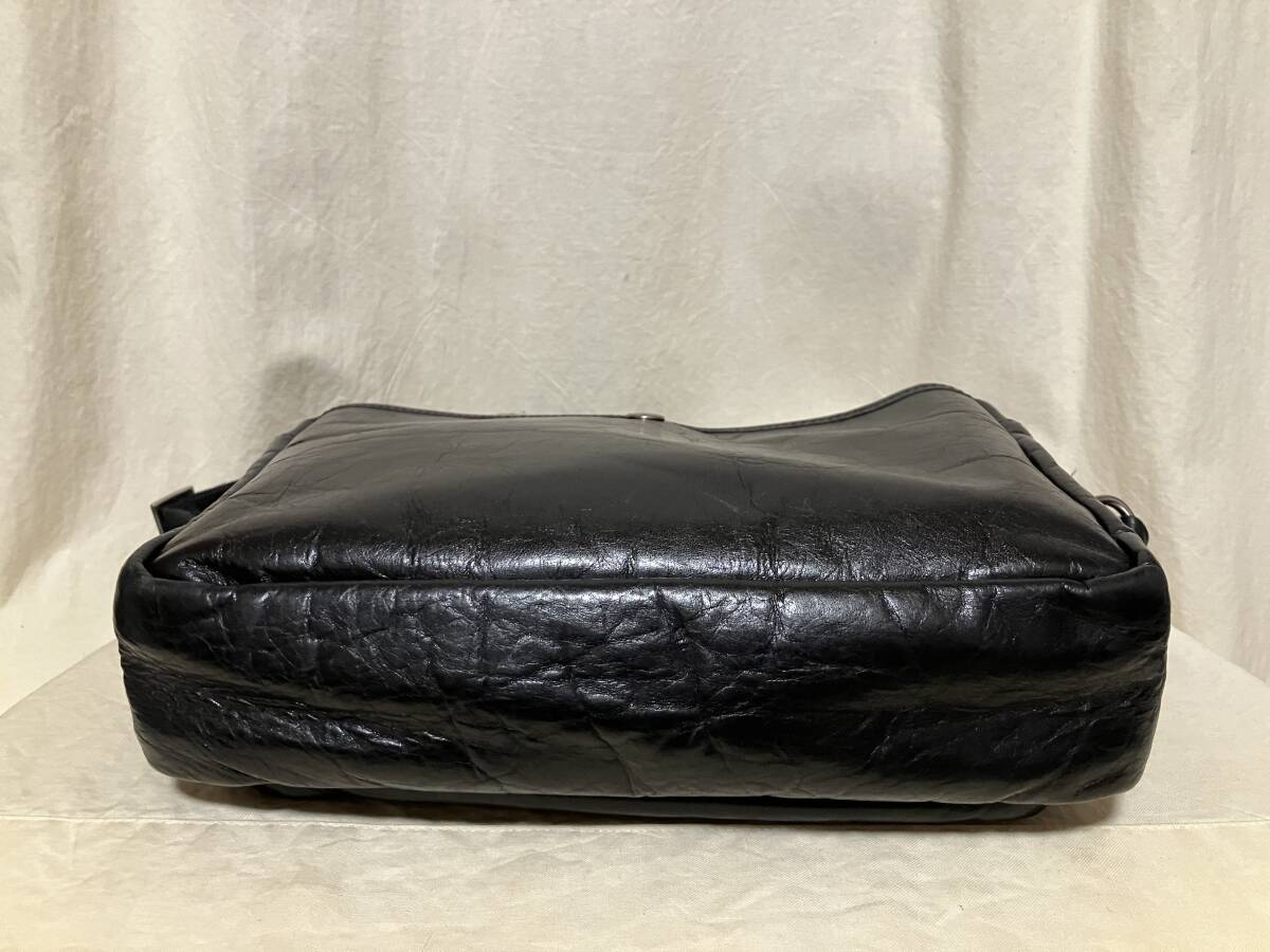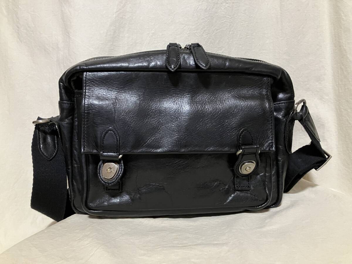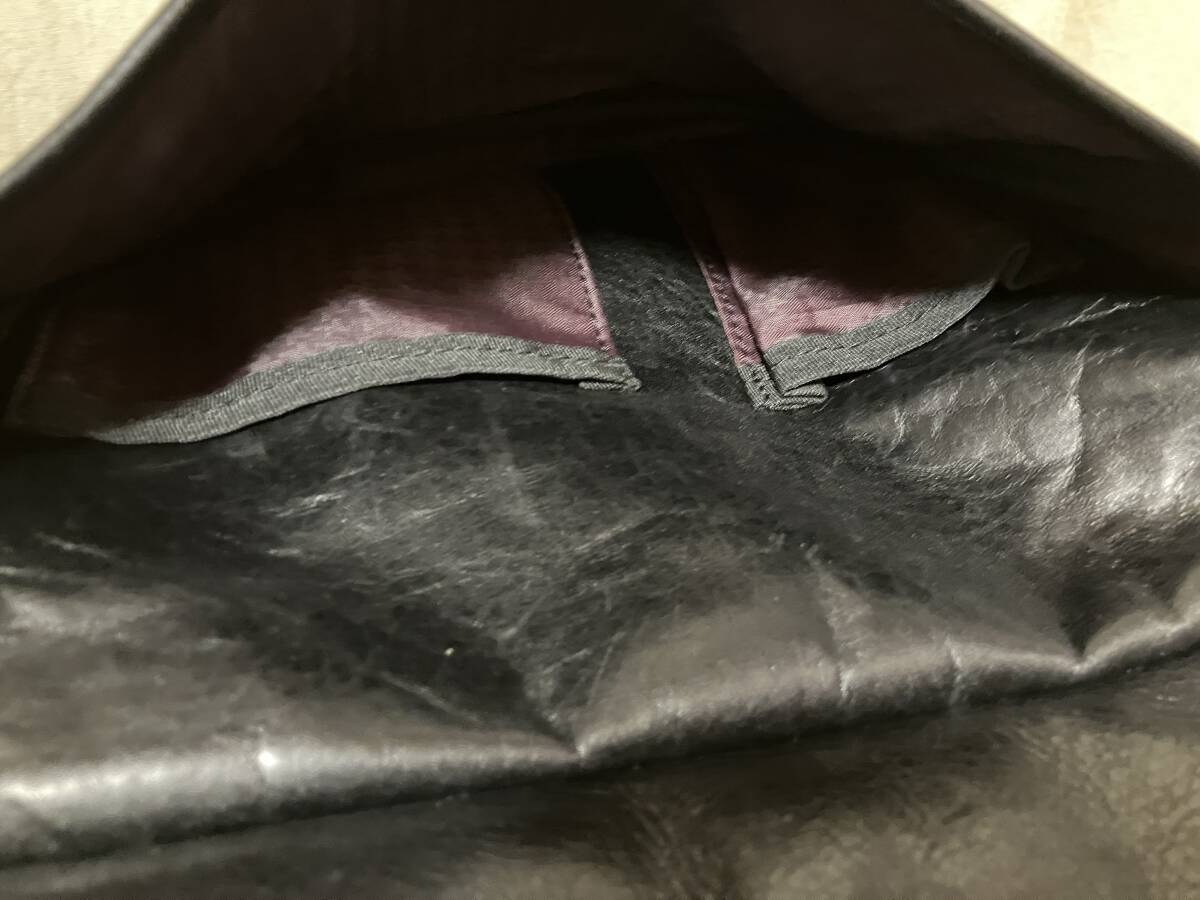 | 色:光沢のある黒 ギラギラではありません いずれも表現するのが難しい微妙な色です ご了承下さい 素材:記載はありません 牛革のようです 比較的しっかりしています(バリバリゴワゴワではありません) サイズ: 採寸:.たかさ22センチ 幅28センチ まち(底)6センチ 重さ500グラム 測り所が微妙です 参考程度としてお考え下さい 正面/被せをホックで開けるとポケットあります(内部に小さめのポケット) 背面/ホックで開け閉めする収納 メイン/開け閉めはファスナー(引き手が二つ) 内側/片側にファスナーで開け閉めする収納、反対側に仕切りのある収納 中古品です 家人が一時期使用して保管していました(期間回数等の詳細は不明です 御了承下さい) 革製品特有の使用感あります 目立たない程度のスレやキズあります 底や底角周辺がスレて地が見えるようなダメージはまだ発生していないようです ※写真参照/内部のネームに薄汚れあります 保管や使用に伴うたたみじわやクセあります 特に目立つような傷汚れ等は見当たりません 今後も使用して頂けるバッグだと思います 上記の事及び、中古品をご理解頂ける方宜しくお願い致します |