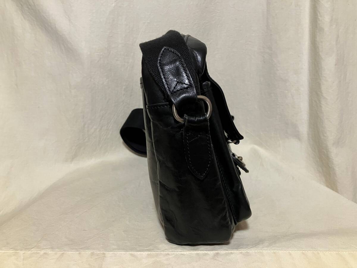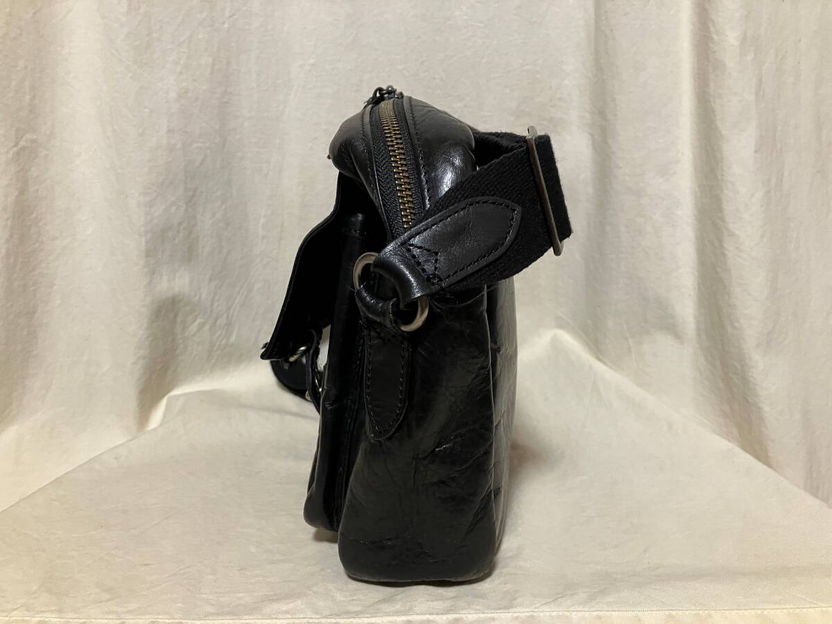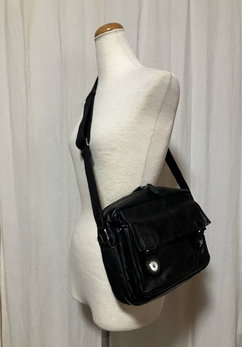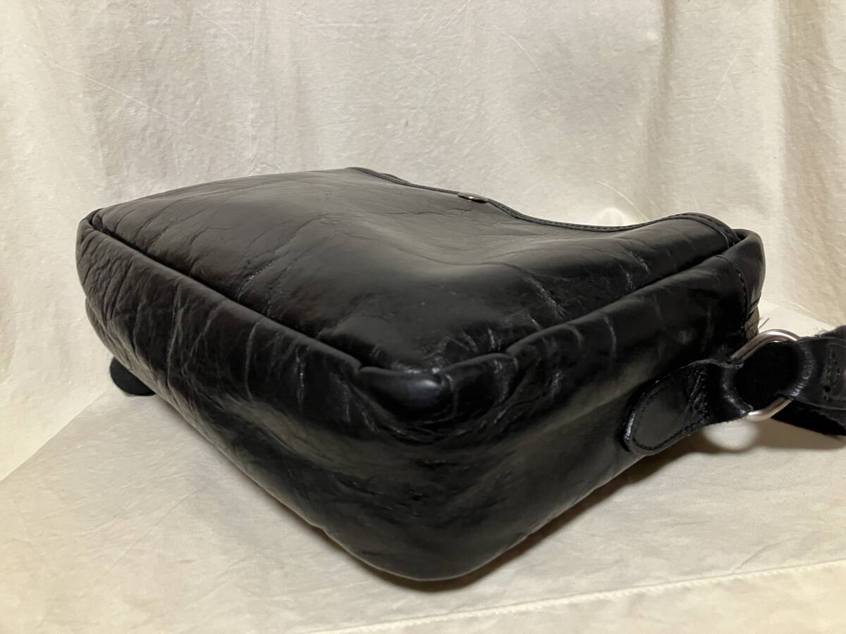 | 色:光沢のある黒 ギラギラではありません いずれも表現するのが難しい微妙な色です ご了承下さい 素材:記載はありません 牛革のようです 比較的しっかりしています(バリバリゴワゴワではありません) サイズ: 採寸:.たかさ22センチ 幅28センチ まち(底)6センチ 重さ500グラム 測り所が微妙です 参考程度としてお考え下さい 正面/被せをホックで開けるとポケットあります(内部に小さめのポケット) 背面/ホックで開け閉めする収納 メイン/開け閉めはファスナー(引き手が二つ) 内側/片側にファスナーで開け閉めする収納、反対側に仕切りのある収納 中古品です 家人が一時期使用して保管していました(期間回数等の詳細は不明です 御了承下さい) 革製品特有の使用感あります 目立たない程度のスレやキズあります 底や底角周辺がスレて地が見えるようなダメージはまだ発生していないようです ※写真参照/内部のネームに薄汚れあります 保管や使用に伴うたたみじわやクセあります 特に目立つような傷汚れ等は見当たりません 今後も使用して頂けるバッグだと思います 上記の事及び、中古品をご理解頂ける方宜しくお願い致します |