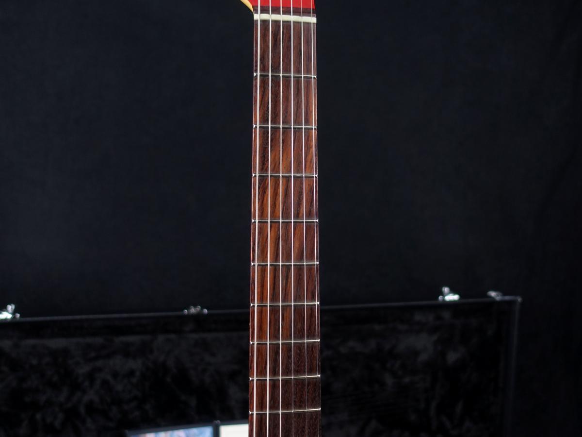 リオレウスを表現したオリジナルのカラーリングやピックガードの素材、全てブラックで統一したハードウェアなどにも拘った、唯一無二のギターです。