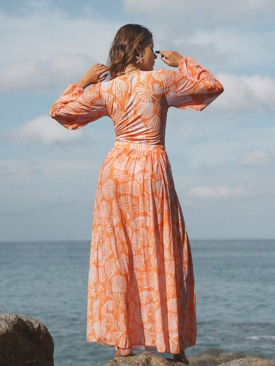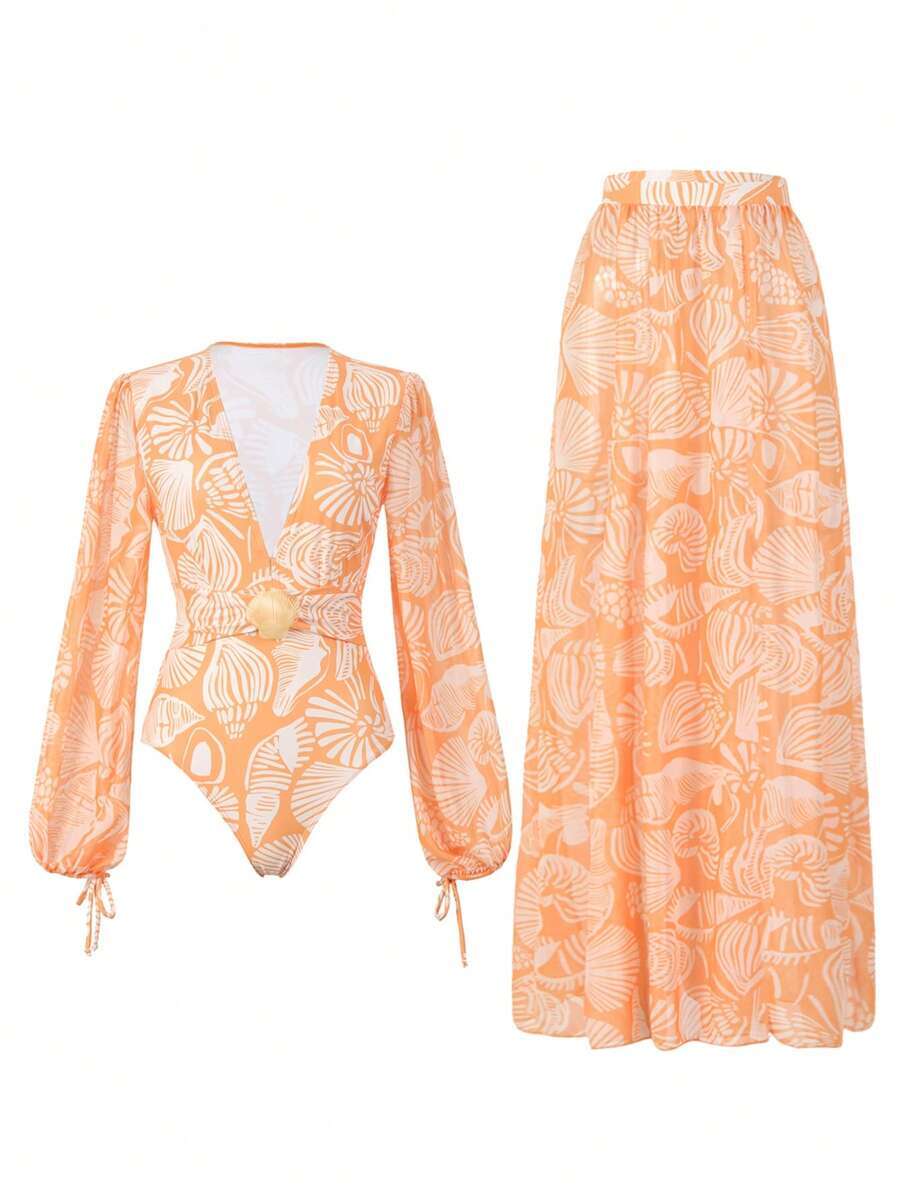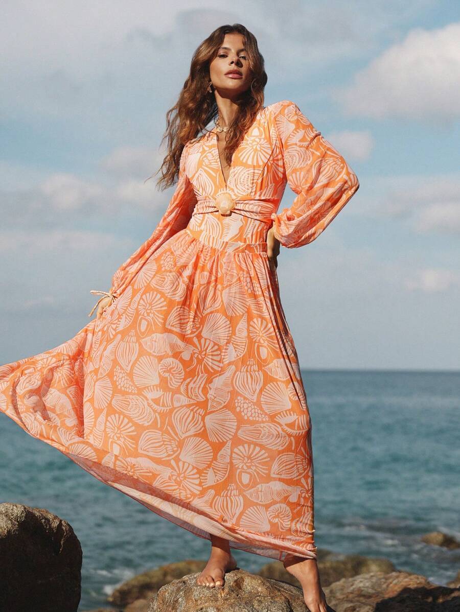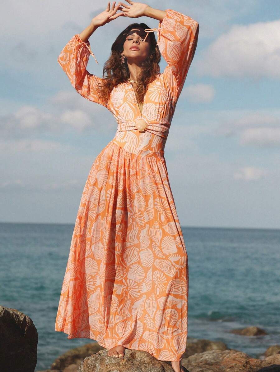 レディース 水着 ワンピース 春ブレイク レディース オレンジ ランダム柄 長袖 ネック ワンピース水着 ルフィヘムビーチドレス