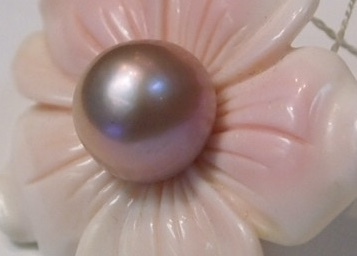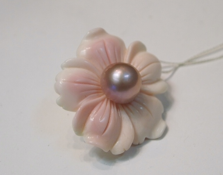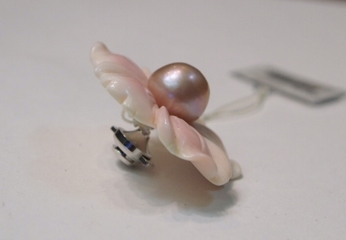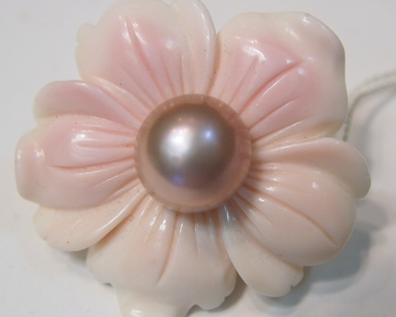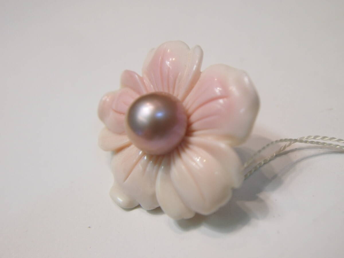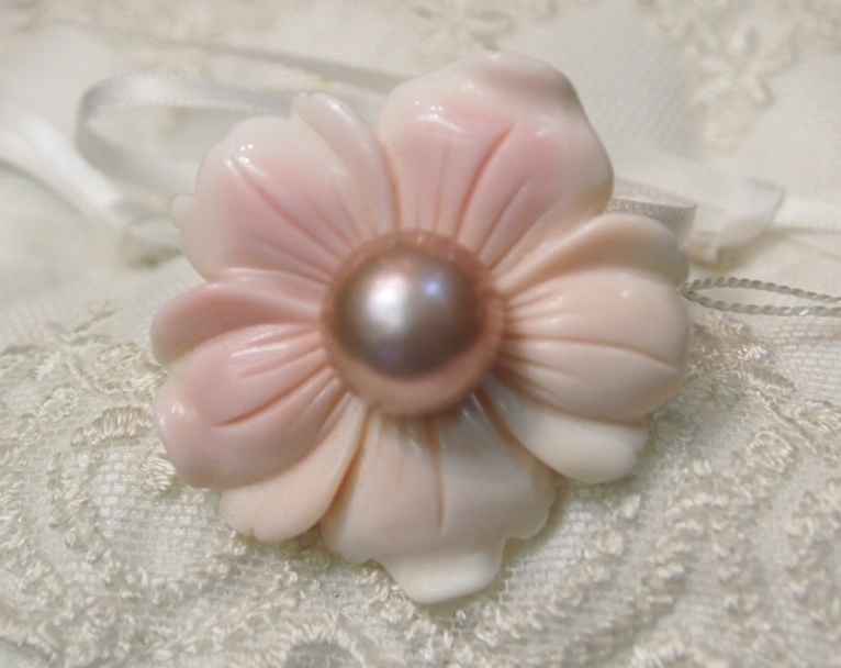 淡いピンクが可愛らしいコンクシェルの「花」モチーフ中央に美しい光沢の淡水真珠を添えた14金ホワイトゴールド製の留針を使用したブローチです。
