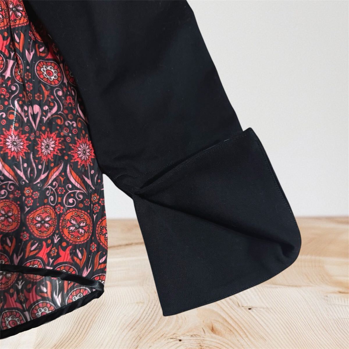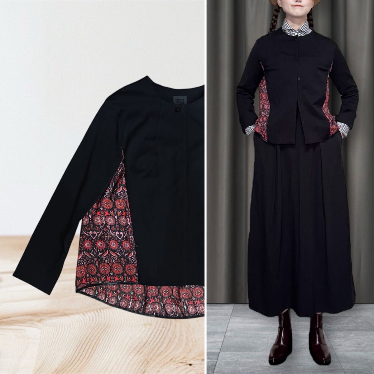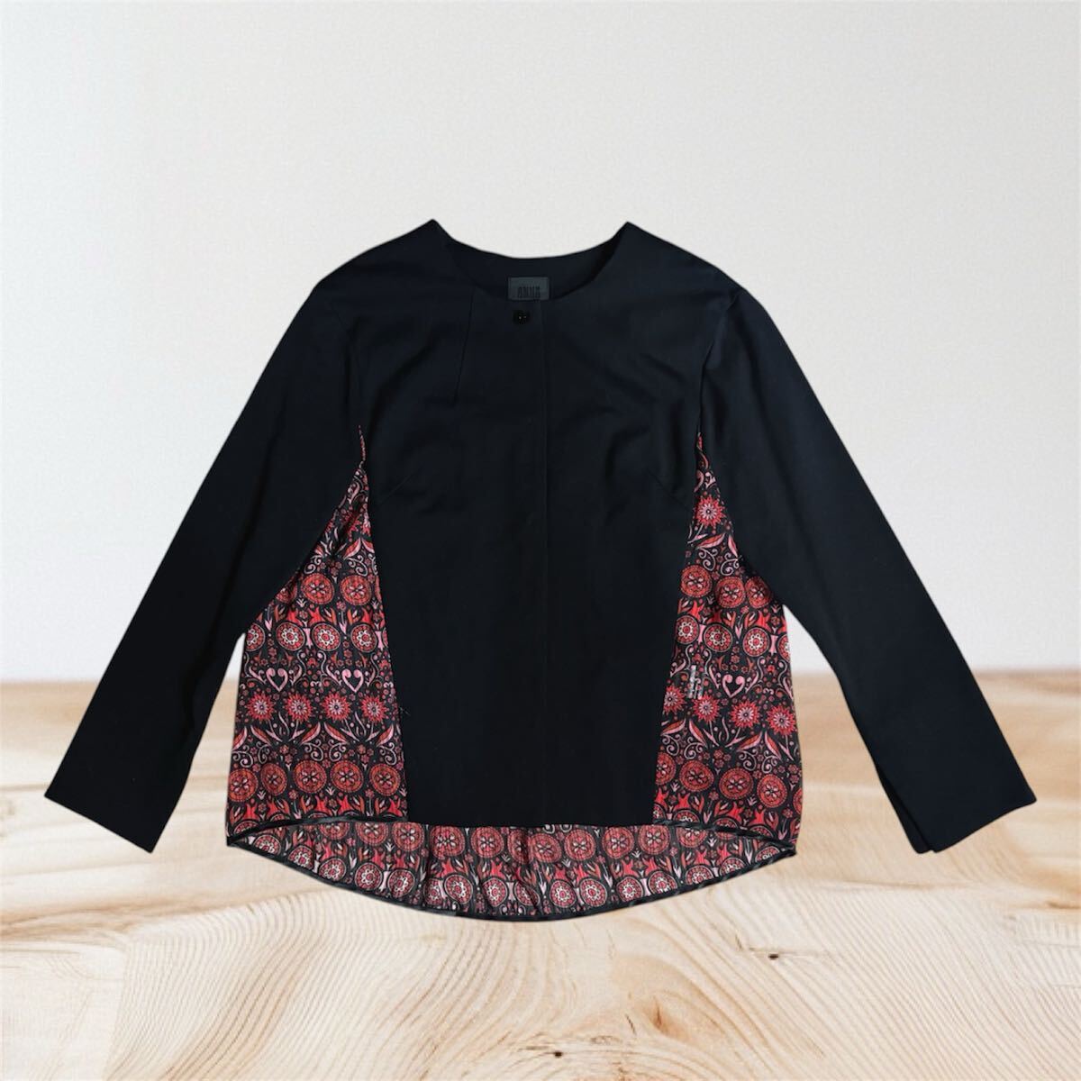 アナスイのノーカラーのブラックジャケット、後ろから両サイドまで綺麗な柄の異素材の切り替えデザインになっており、綺麗でゆったりとしたシルエットが特徴。アニエスベー 、コムデギャルソン、msgm、エミリオプッチ
