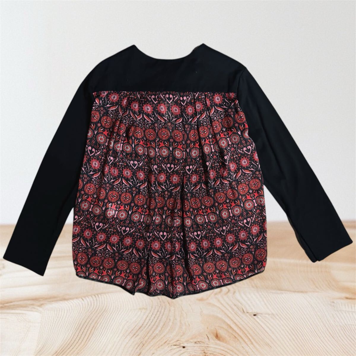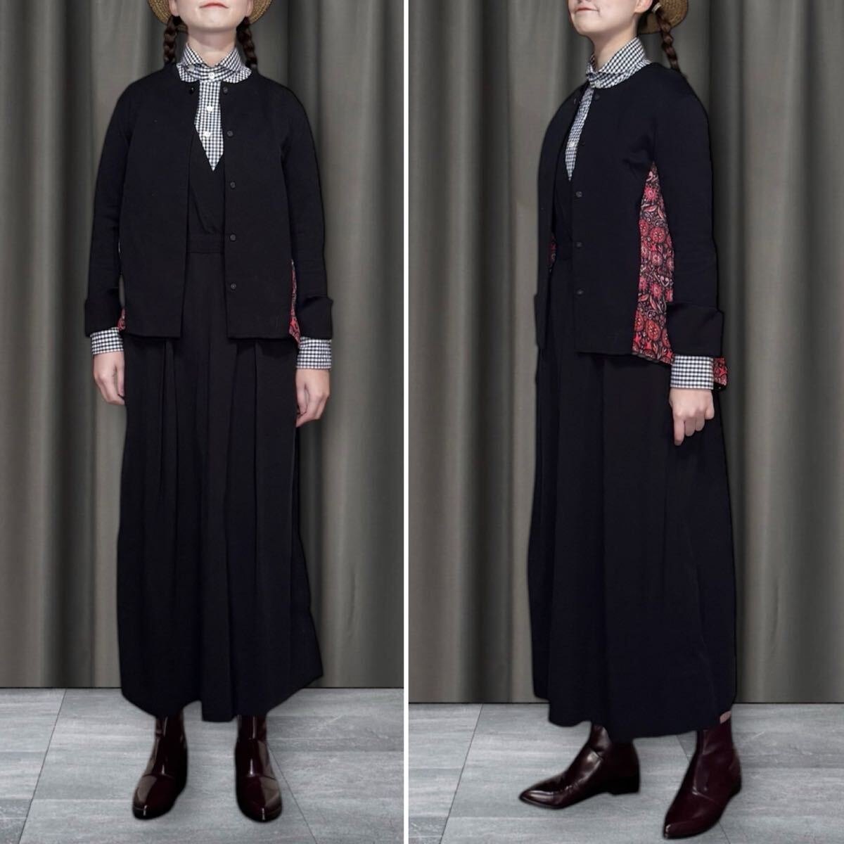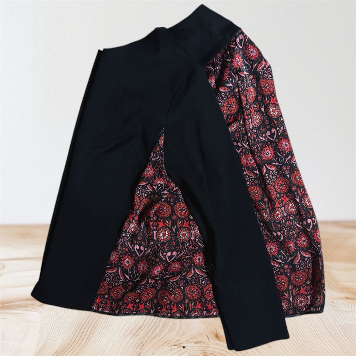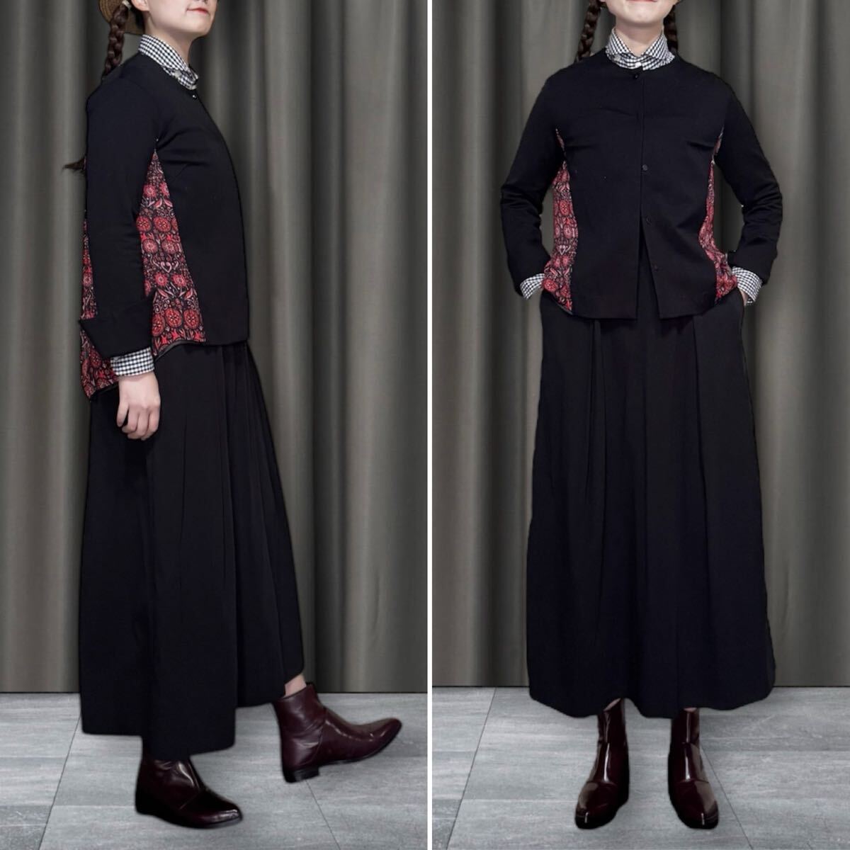 アナスイのノーカラーのブラックジャケット、後ろから両サイドまで綺麗な柄の異素材の切り替えデザインになっており、綺麗でゆったりとしたシルエットが特徴。アニエスベー 、コムデギャルソン、msgm、エミリオプッチ