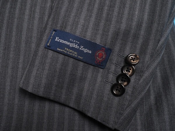 水牛釦、AMFステッチ、ゼニアジャガード裏地、お台場仕立てなど、百貨店向けならではのオーダーメイド並みの最上級仕立てで仕上げられております。ファブリックはイタリアの最高級ファブリックメーカー、ゼニア社のウール100%生地を使用。エルメネジルド・ゼニアのトロピカルは、オーストラリア産のファインウールで作られた単糸をヨコ糸に、双糸をタテ糸に使用し、交互に交差することで織り上げる、「平織り」で織られているため、軽量で吸湿性が高く、生地にハリがあり丈夫で型崩れしにくい夏向き素材。清涼感のあるさらっとした肌触りにとても人気があり、また、扱いやすい服地のため、ゼニアは初めてという方におすすめしたい、クラシックな色柄を中心とした春夏の定番服地です。
