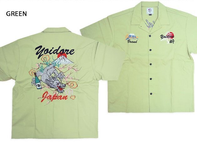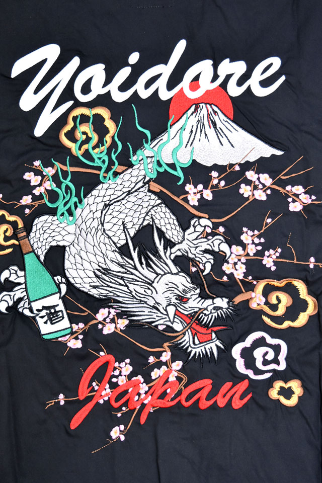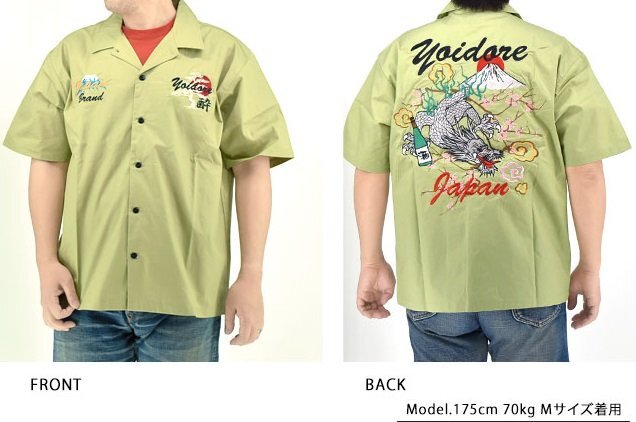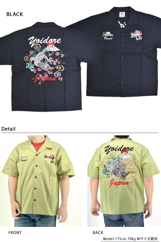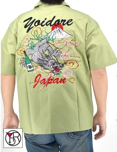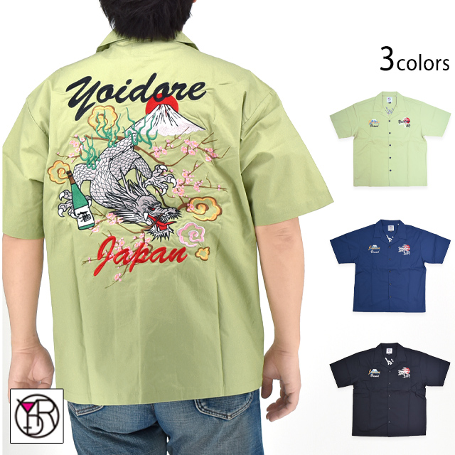 すべての酔いどれに届ける、酔いどれのためのブランド「YOIDORE」より「スカ半袖シャツ(825222)」が入荷してまいりました。 酔いどれ(酔っ払い)に届ける、酔いどれ(酔っ払い)のためのブランド。 お酒をテーマにした様々なデザインを落とし込んで展開。 気鋭のアーティストや酒造メーカー、人気ショップとのコラボレーションや、型にはまらない独特の世界感を表現した新感覚のアパレルブランドです。 老若男女お酒好きな方、お酒のお供にいかがでしょうか。 今回はスカジャン風のデザインをシャツに落とし込んだ、和柄では定番のスカシャツが登場。 もちろん、酔いどれテイストにアレンジされています。 背中には、酒瓶を手にした龍をダイナミックに刺繍しました。 絵柄上部のロゴも「yoidore」になっています。 フロント右胸には富士山を、左胸には松の木と「酔」のロゴをそれぞれ刺繍しました。 ボディーにはぱりっとした素材感の、ややしっかりめのシャツ生地を採用。 ややゆったりめのルーズなシルエットは適度なリラックス感があり、ラフな呑みシーンでのコーディネートに取り入れたいマストなアイテムです。 全ての商品にシーズン毎にデザインが変わる限定ステッカー付きです。 | ||||||||||||||||||||