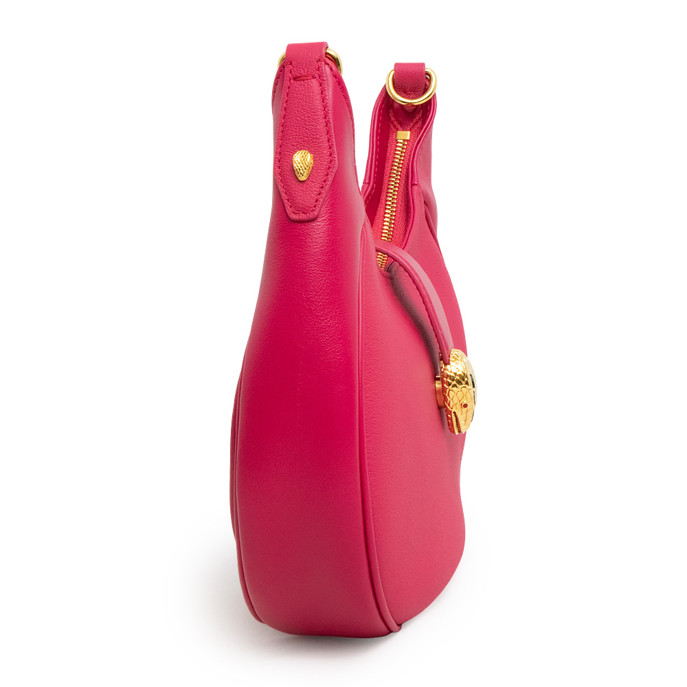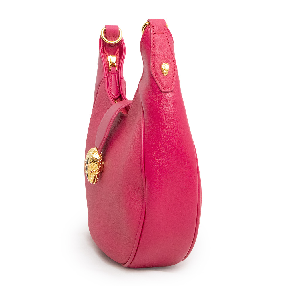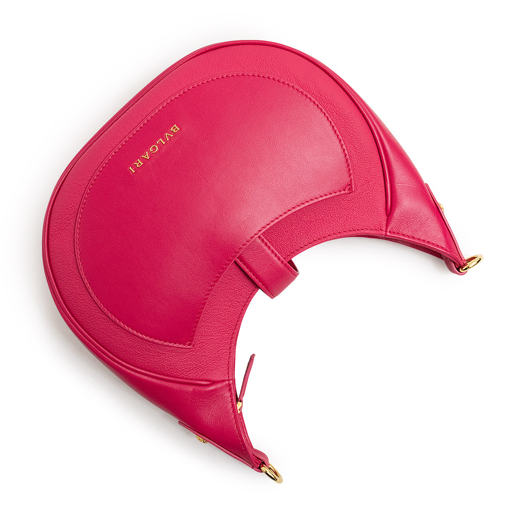 センシュアルな蛇の魅力を再現した、ブルガリの「SERPENTI(セルペンティ)」コレクションの新作「セルペンティ エリプス」。優雅な曲線が美しい、ハーフムーンシェイプのバッグです。中央にあしらわれたメタル製のスネークヘッドは、うろこにブラックオニキス、目はレッドエナメルで装飾され、特別な存在感を放ちます。