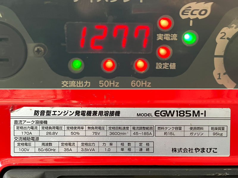 | 規格・仕様 | 【仕様】 ・定格出力電流:170A ・電流調整範囲:45~185A ・定格負荷電圧:26.8V ・無負荷電圧:75V ・使用率:50% ・使用溶接棒:2.0~4.0mm ・電圧調整:インバータ ・定格電圧:100V 50/60Hz ・定格出力:3.5kVA ・定格電流:35A ・燃料:ガソリン ・タンク:15L ・寸法:L730*W545*H647mm ・乾燥質量:95kg |