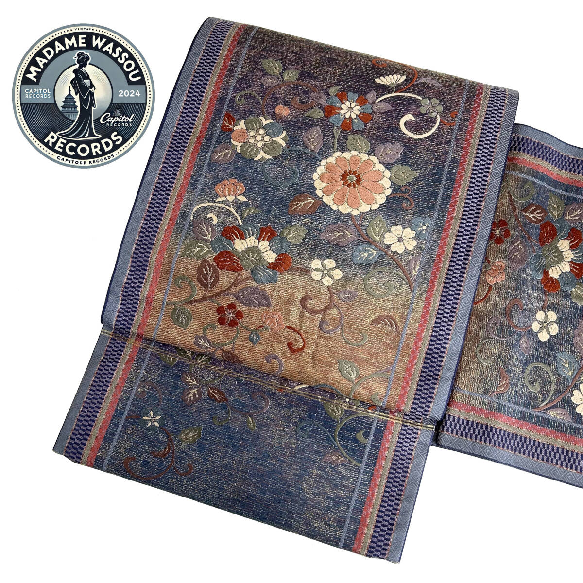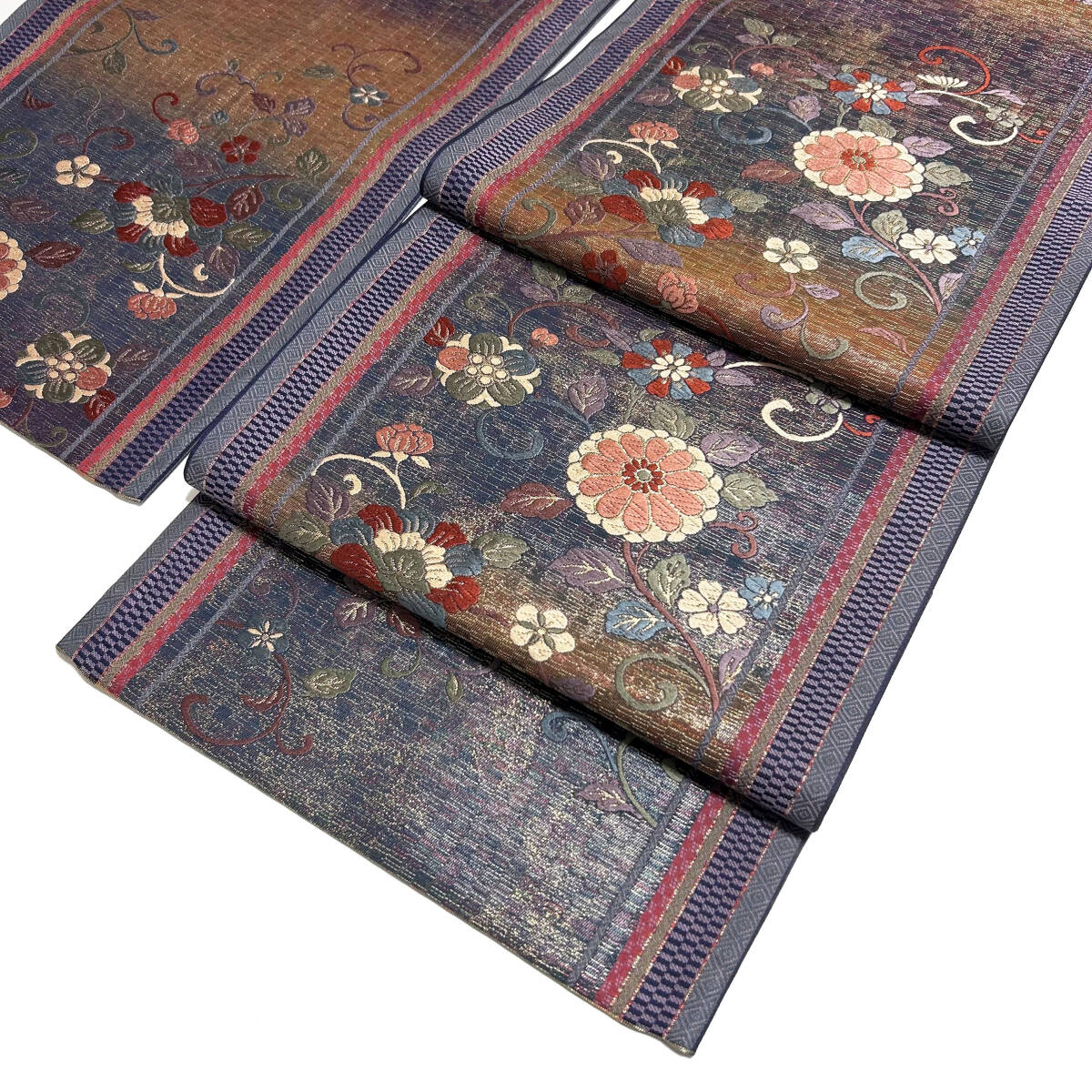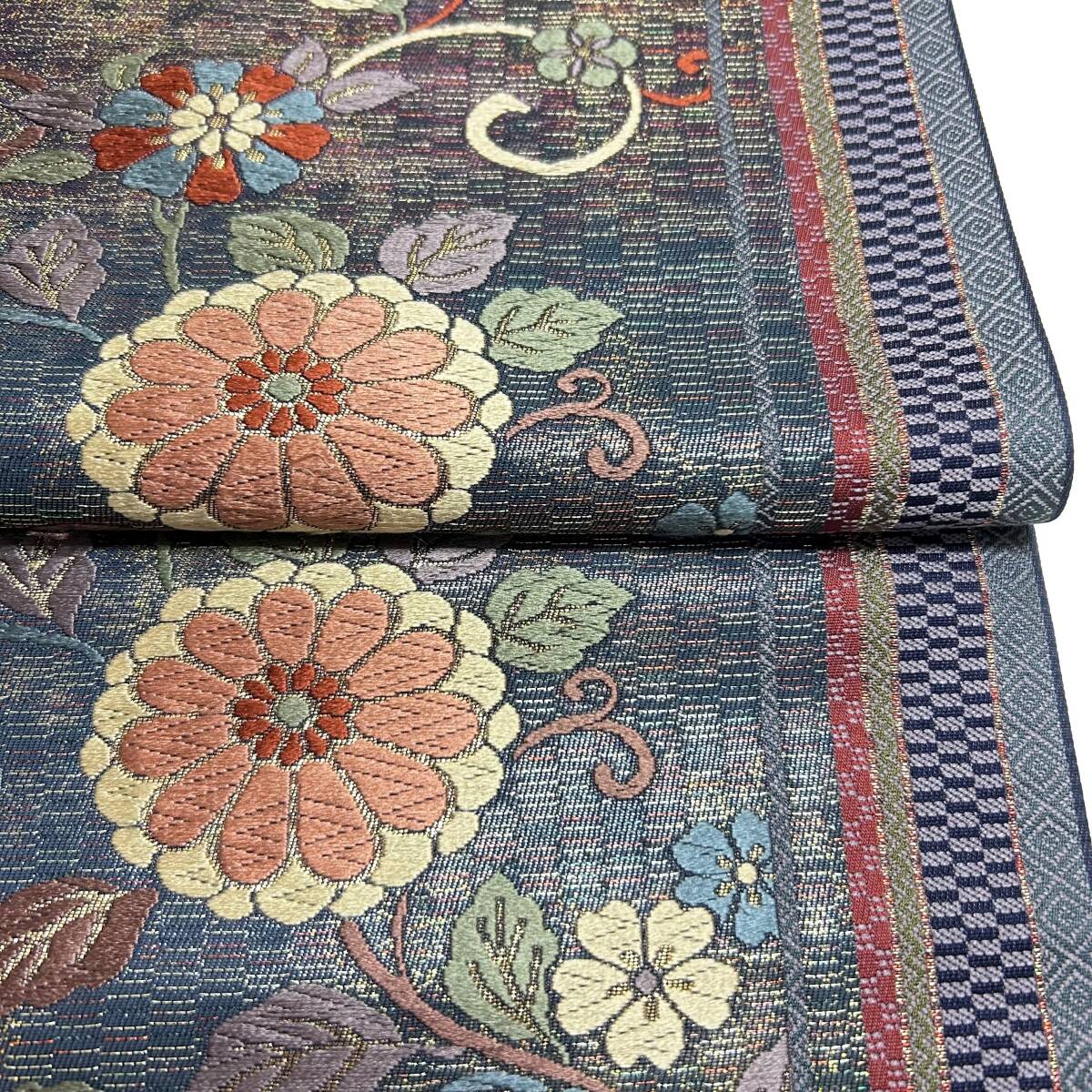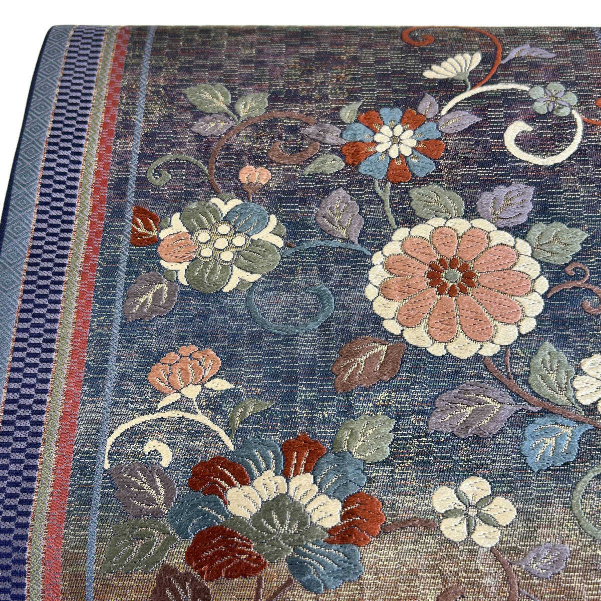 青・緑・茶色の地に金糸を使用した花唐草が織り出されております。