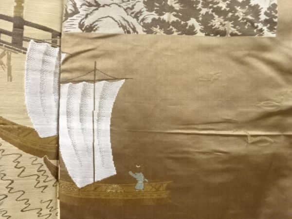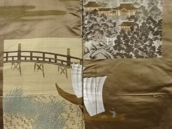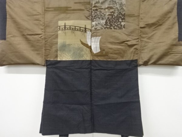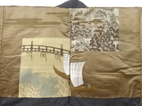 ys7374315; 寺院風景に小舟模様織り出し緞子肩裏本場泥大島紬男物羽織【アンティーク】【着】