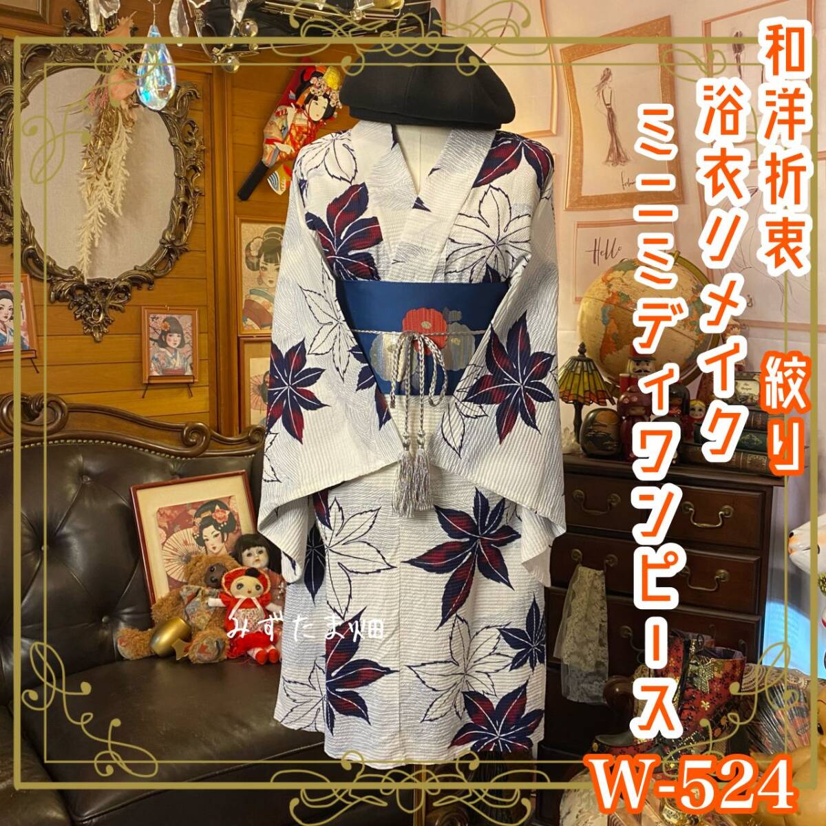 【絞り浴衣リメイク ワンピース ドレス 名古屋帯サッシュベルト 和洋折衷 レトロ 古着 ハンドメイド「風にゆれる、もみじの詩。」 W-524】