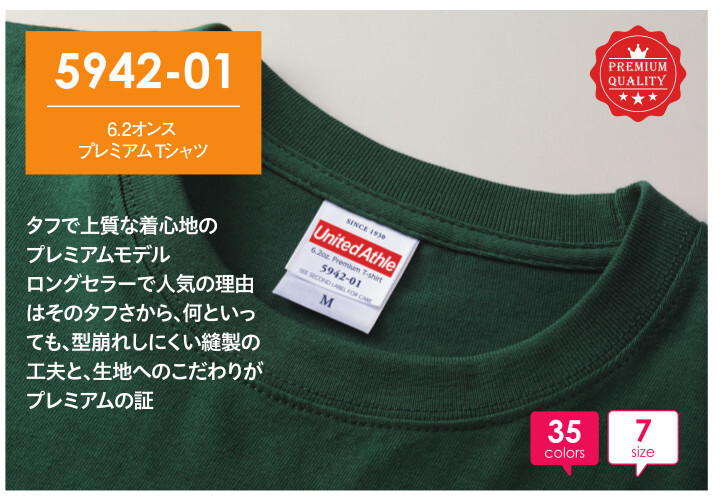 首リブの強度を保つ「ダブルステッチ」や毛羽立ちを抑える「コーマ糸」を採用したハイグレードモデル