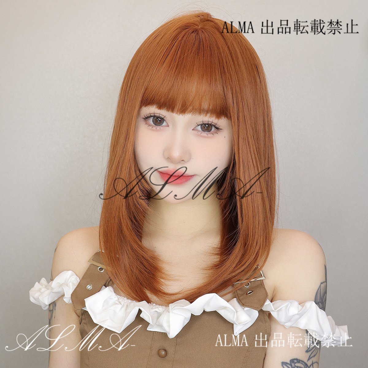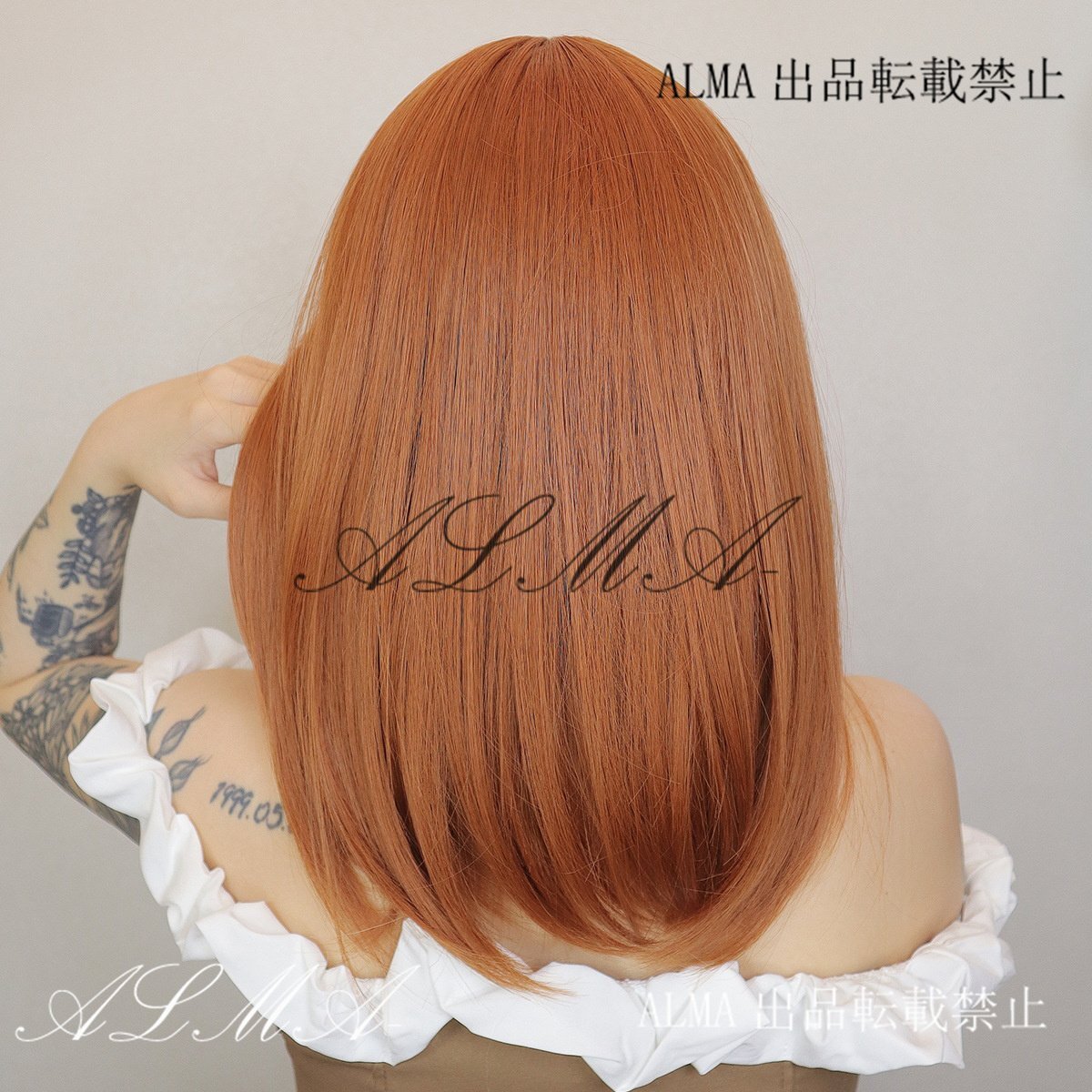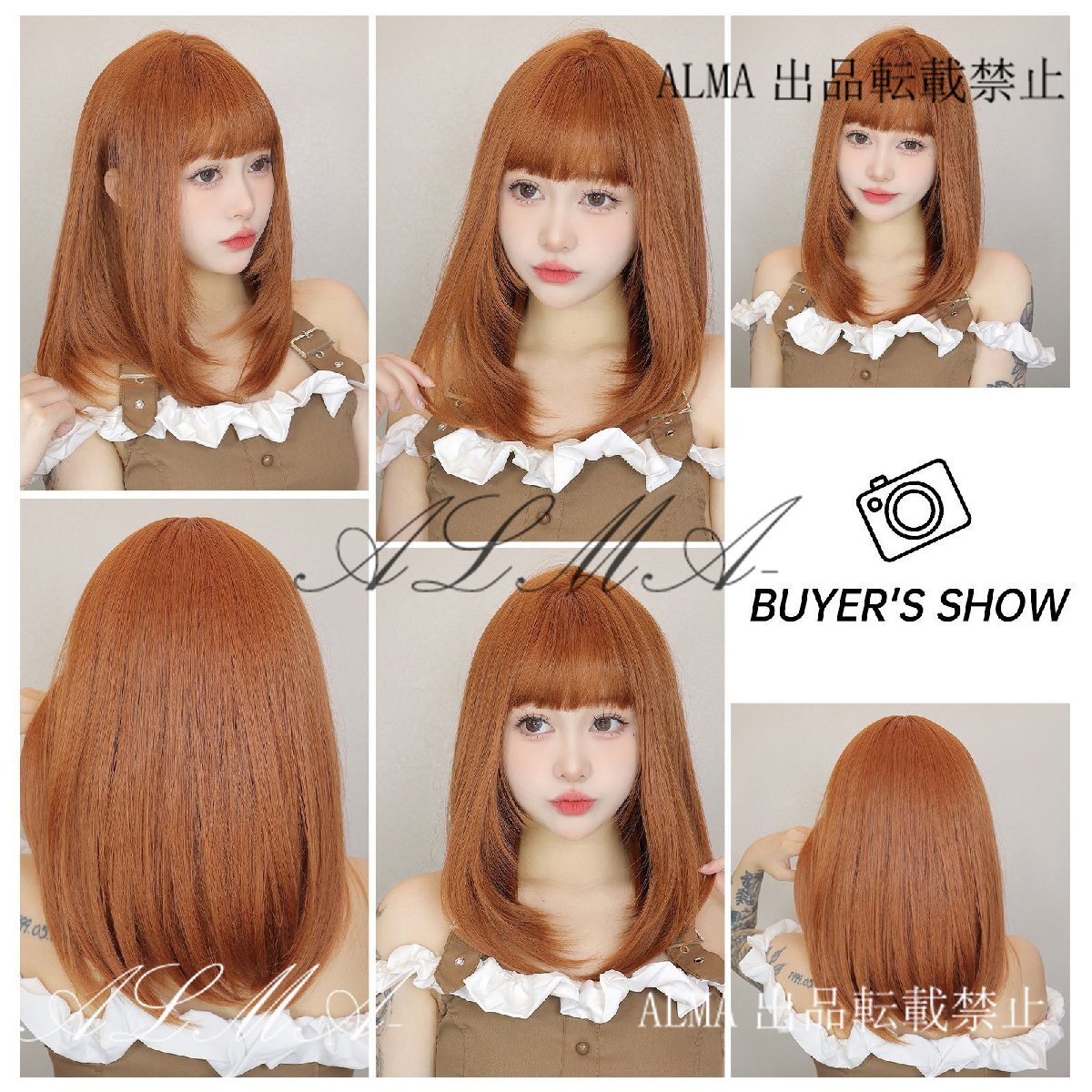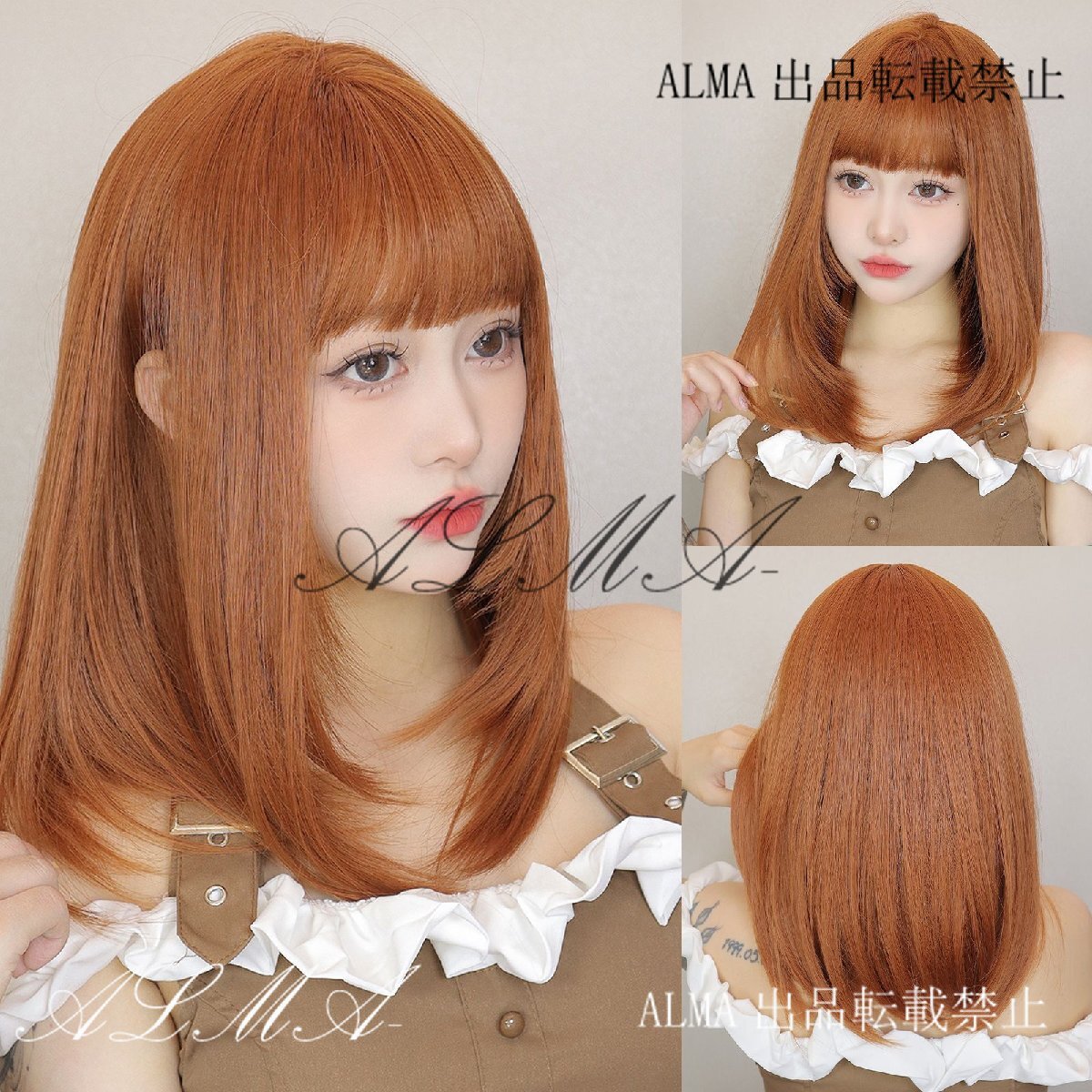 新品人毛 オレンジ色のミディアムストレートヘア 前髪はストレート つむじ部分手植え 自然に見えますフルウィッグ