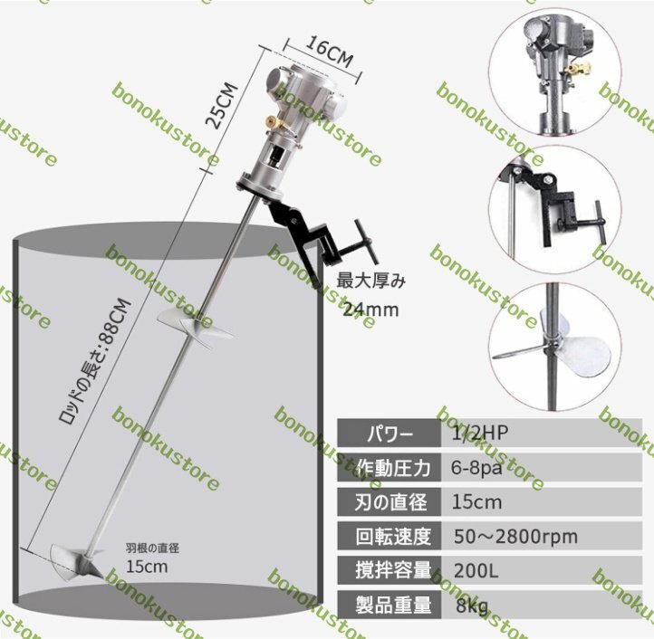商品の説明クランプバレル空気圧ミキサーは、塗料、染料、接着剤、化粧品、香料、接着剤、水処理剤などを混合できます。また、その他のさまざまなコーティング剤の混合にも使用できます。仕様:名前: 空気圧撹拌機 ドラム缶取付バージョン: 3 シリンダー (50 ガロン)/5 シリン