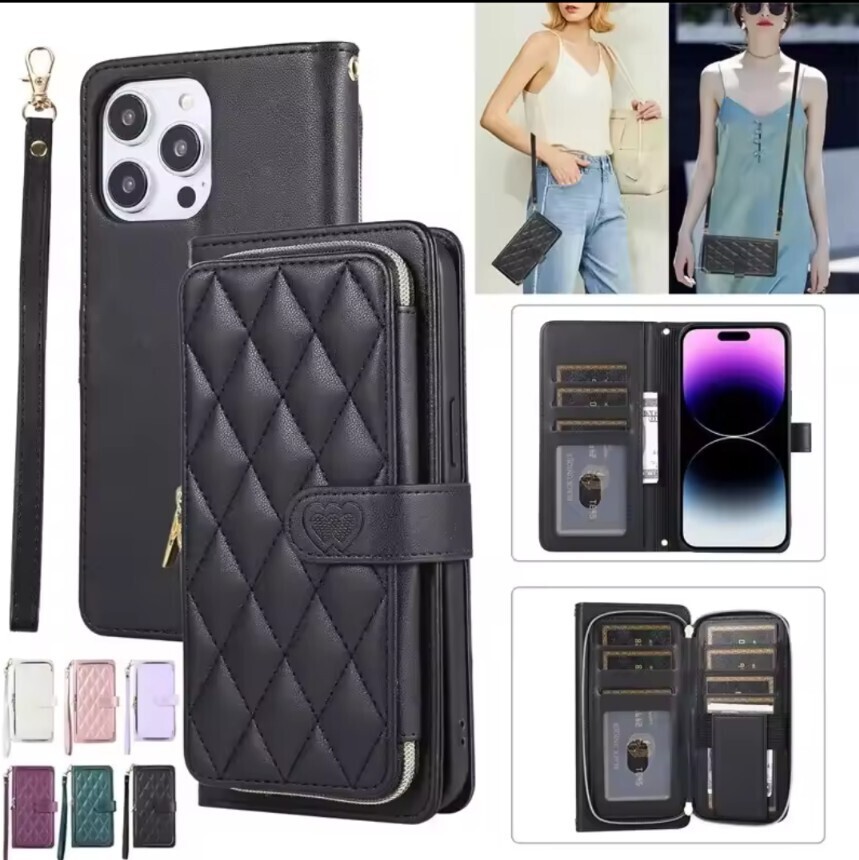 iPhone 14 Pro Max用 キルティングレザーウォレットケース ブラック 肩掛けストラップ  手帳型 財布付