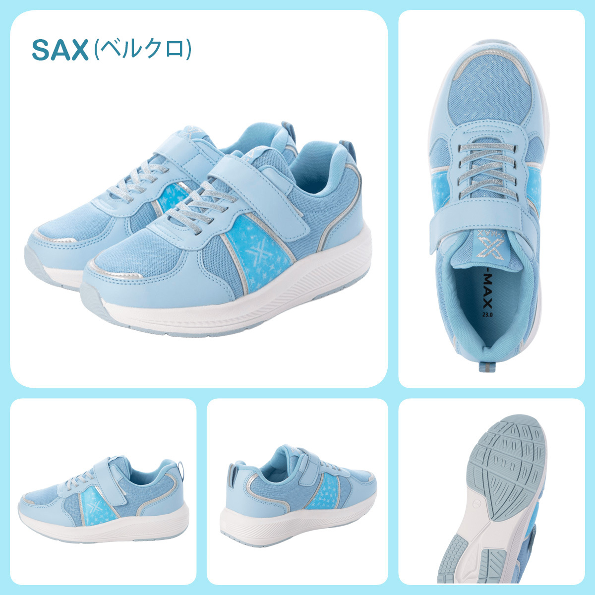ベルクロバンド(19.0-23.0)/コードストッパー(23.5-25.0)とプルストラップの組み合わせで脱ぎ履きがしやすく、甲部分の伸縮性ゴム紐は最適なフィット感があります。