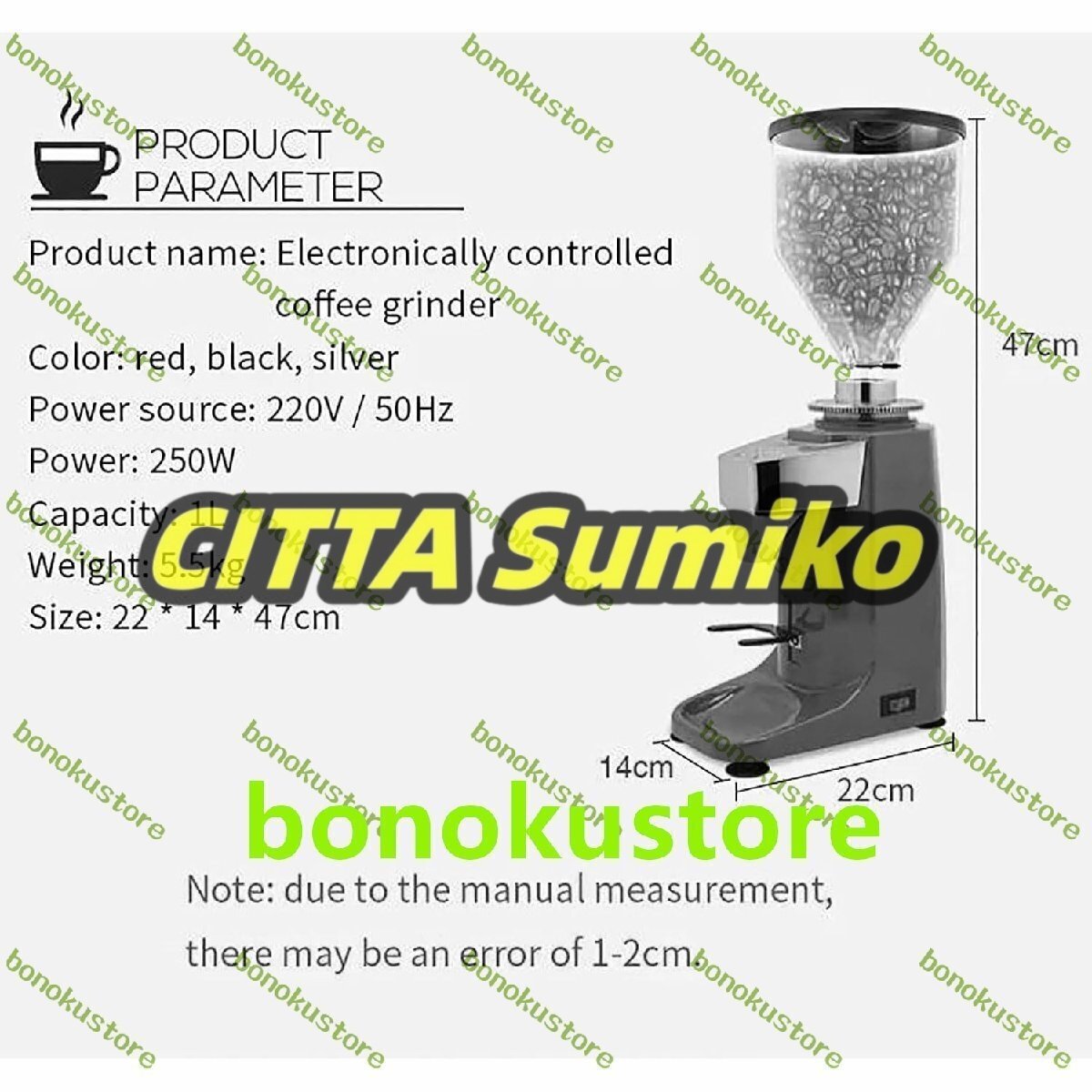 名前: 電気コーヒーグラインダー 電力: 250W 電圧: 220V サイズ: 22x14x47cm 容量: 1.5L ギア位置: 19 ギア調整