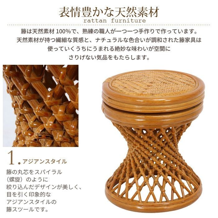 商品説明 | 軽くて丈夫な籐(ラタン)でできたスツール。 座面が360度回転します。 軽量なのでいろんな場所で使えます。 【商品仕様】 ■商品サイズ:[全体]約幅320×奥行320×高さ390mm ■重量:約3kg ■材質:ラタン(籐)、アミノアルキド樹脂塗装 ■カラー:ハニー |