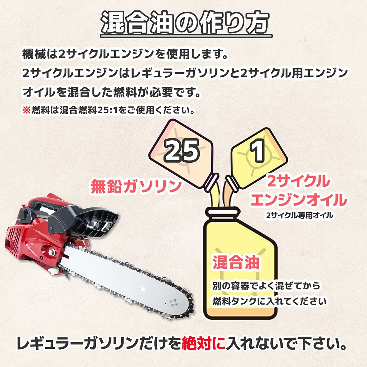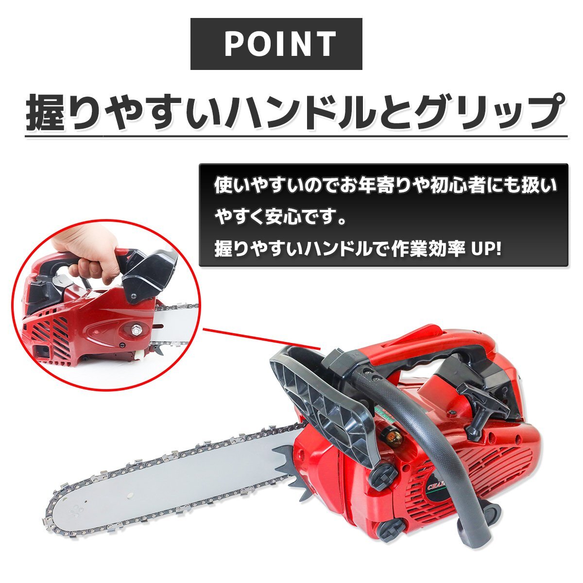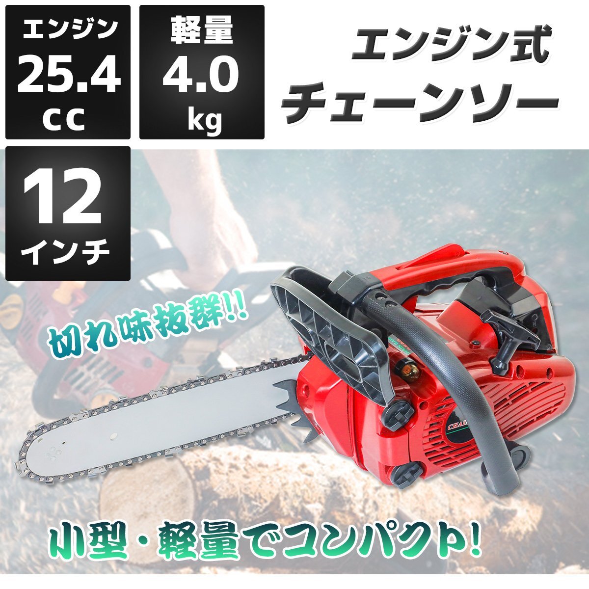 | 商品の詳細 | 薪作りや伐採作業で大活躍のチェーンソー登場! 公園や農地・果樹園など幅広く活用できます!! 【商品仕様】 エンジン:25.4cc/2ストローク 空冷式 エンジンパワー:0.9kw アイドリング:3000 rpm ソーチェンピッチ:3/8インチ ソーチェンゲージ:0.058インチ ガイドバーサイズ:12インチ 混合燃料 25:1(ガソリン25に対してオイルを1) 燃料タンク容量:230ml オイルタンク容量:160ml 本体総重量(約):3.2kg 【セット内容】 ・本体 ×1 ・ソーチェン ×1 ・ガイドバー ×1 ・ガイドバーカバー ×1 ・工具 一式 | |