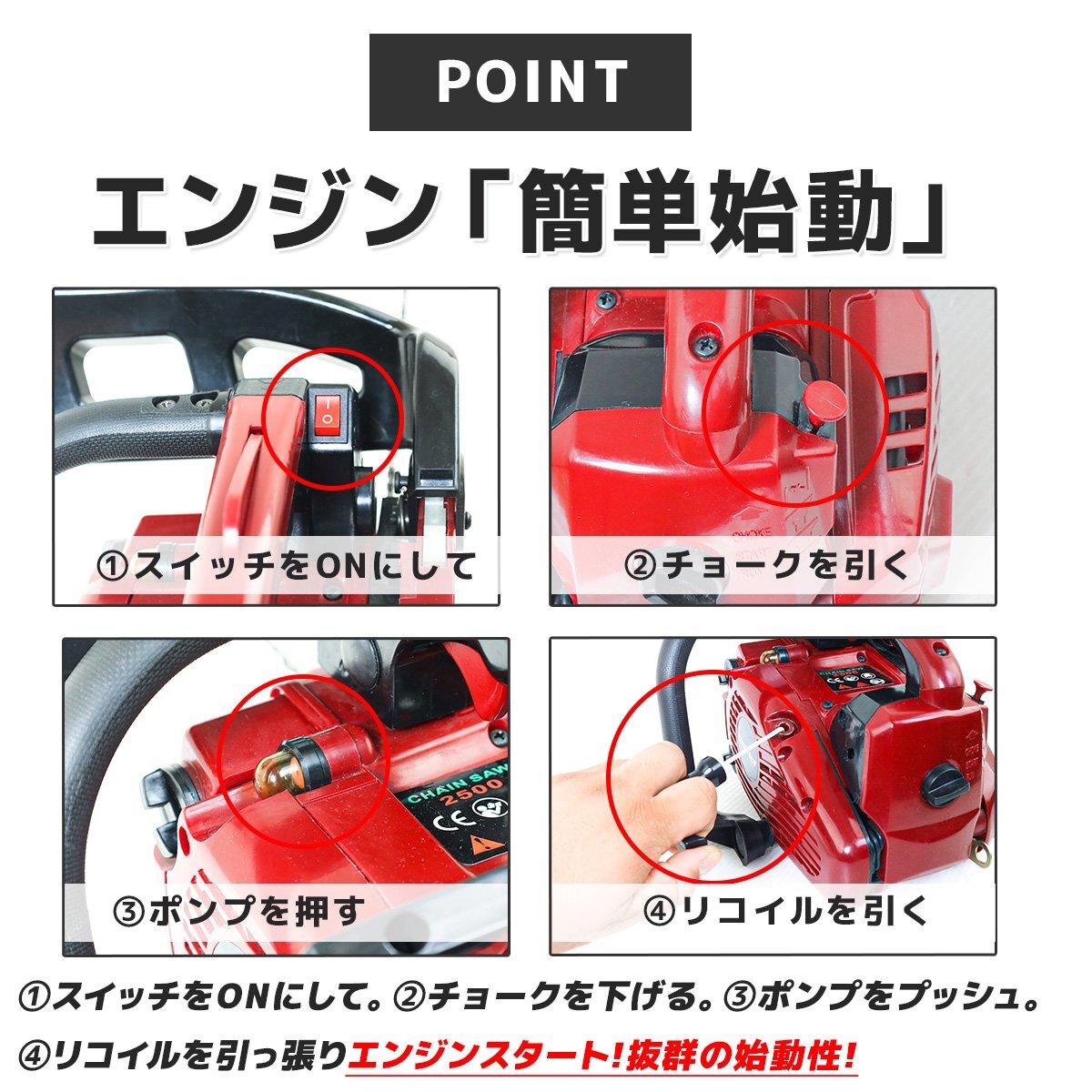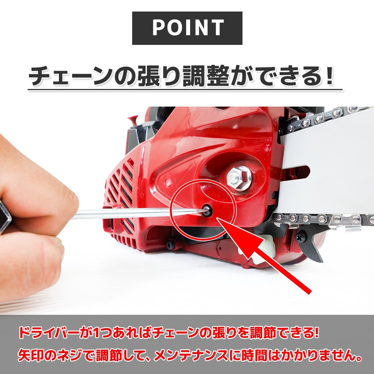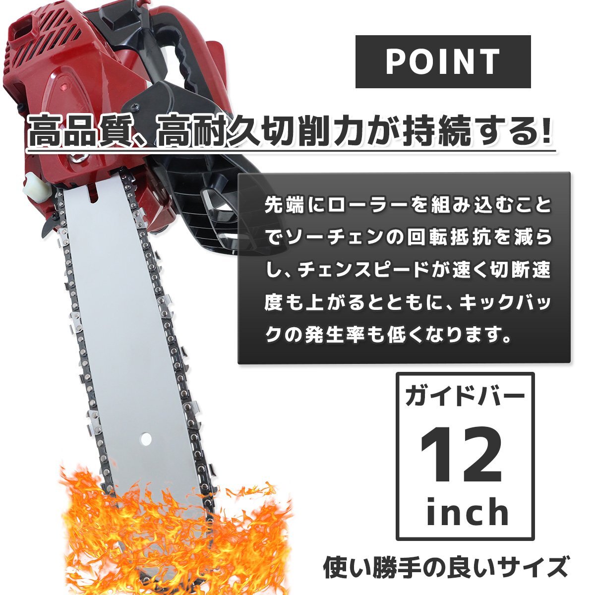 | 商品の詳細 | 薪作りや伐採作業で大活躍のチェーンソー登場! 公園や農地・果樹園など幅広く活用できます!! 【商品仕様】 エンジン:25.4cc/2ストローク 空冷式 エンジンパワー:0.9kw アイドリング:3000 rpm ソーチェンピッチ:3/8インチ ソーチェンゲージ:0.058インチ ガイドバーサイズ:12インチ 混合燃料 25:1(ガソリン25に対してオイルを1) 燃料タンク容量:230ml オイルタンク容量:160ml 本体総重量(約):3.2kg 【セット内容】 ・本体 ×1 ・ソーチェン ×1 ・ガイドバー ×1 ・ガイドバーカバー ×1 ・工具 一式 | |