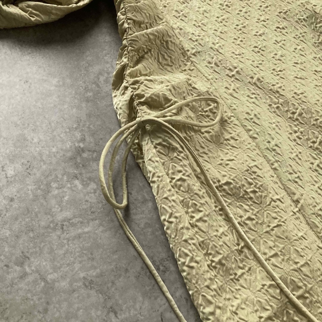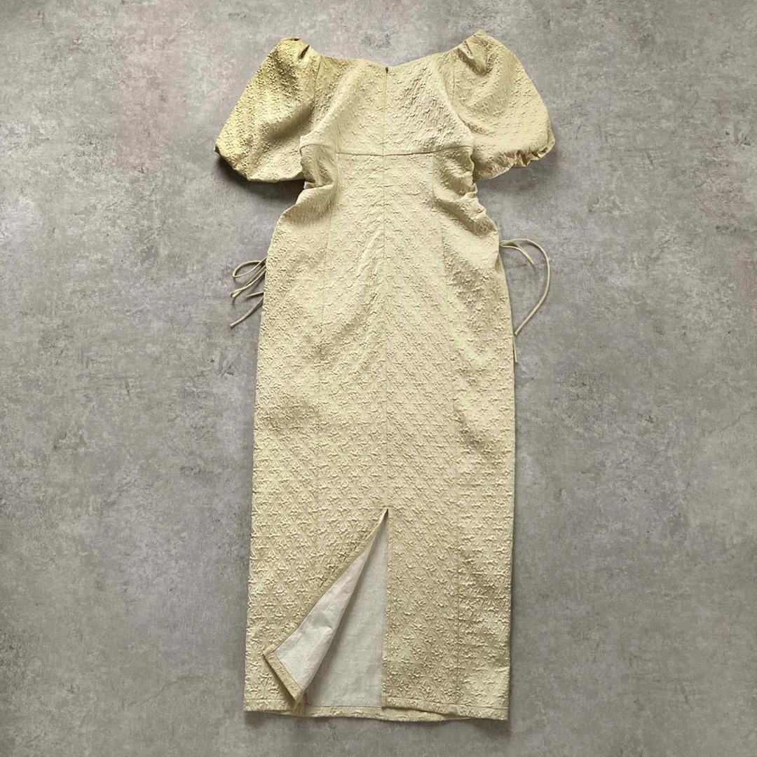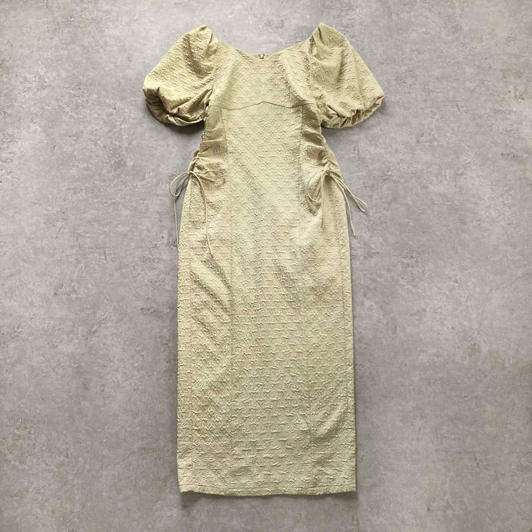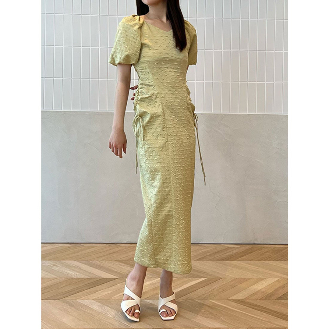 eimy istoire エイミーイストワール パフスリーブロングワンピース ナロー タイト サイドリボン ギャザー エンボス生地 ポコポコ