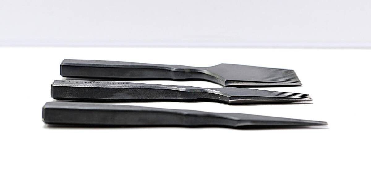 長年の研究と試行錯誤で生まれたこちらのヨーロッパ目打ちは、機能性とスタイルにこだわりがあります。本体は性と硬度に優れたスウェーデンのASSAB社の特殊工具鋼を使用し、熱処理によって刃先が破損しにくく、耐久性に優れています。