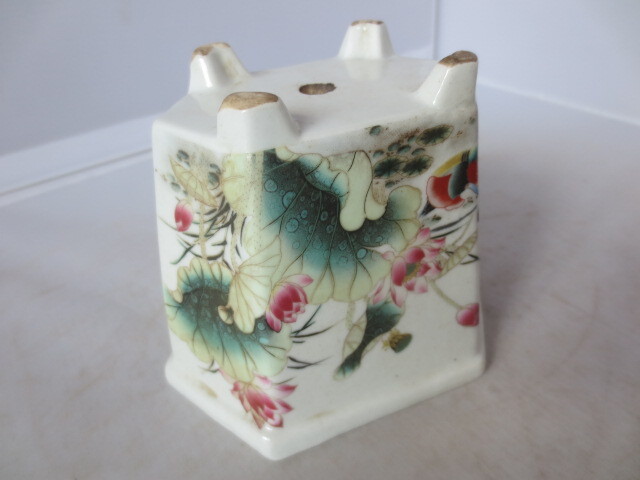 【艸】  南京 SP-1 五彩 花鳥図 詩文入り 小花盆 盆栽鉢 中国古玩 5sp1
