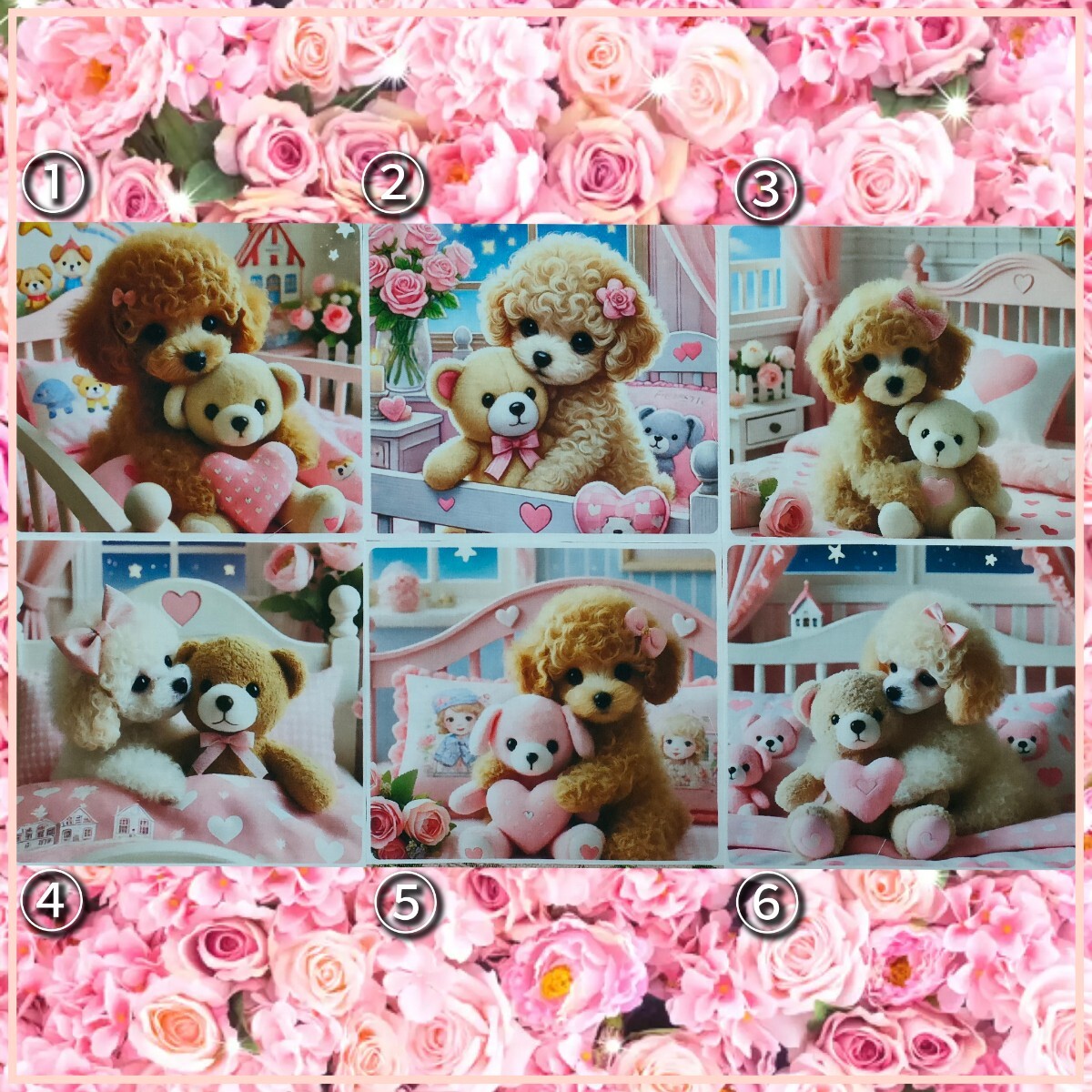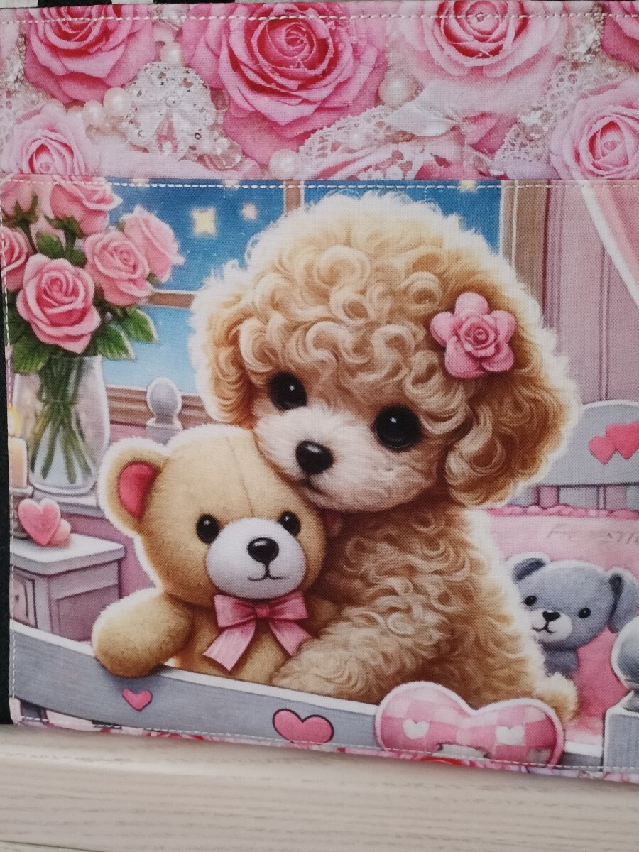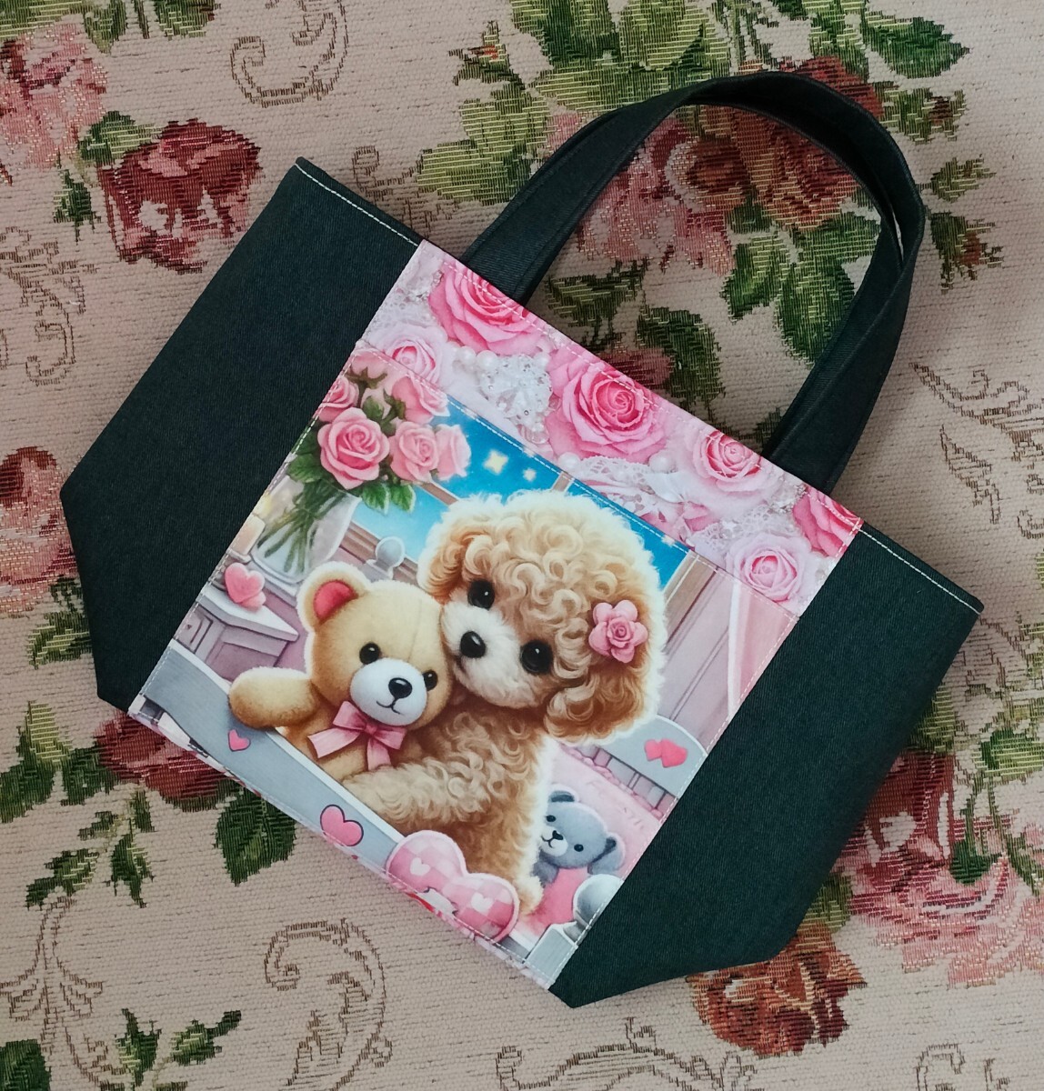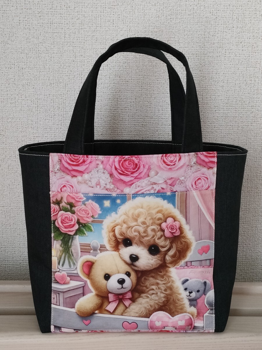 くまのぬいぐるみを抱いた、可愛らしいプードルちゃんのミニトートバッグはいかがでしょうか♪