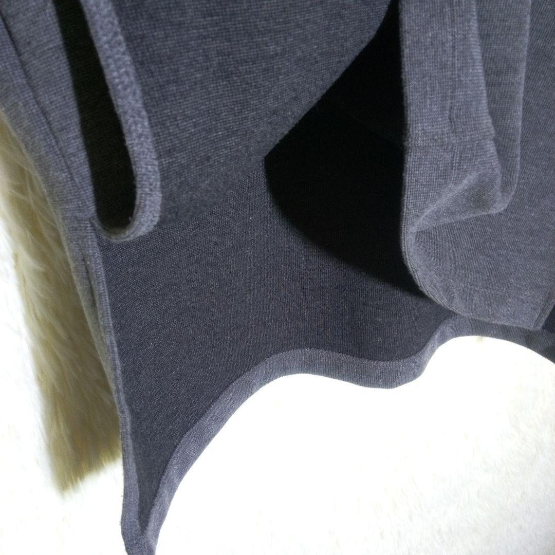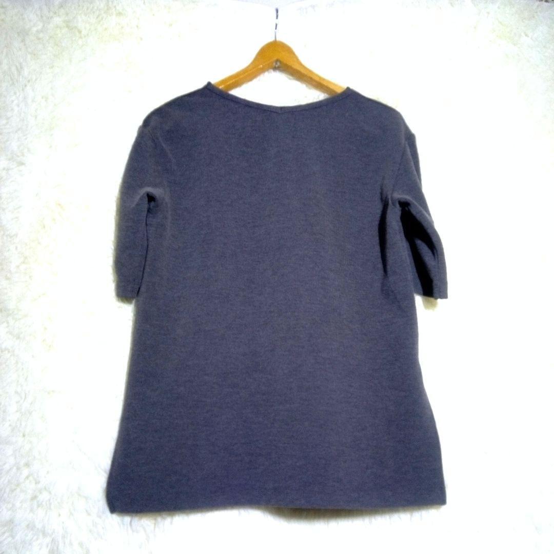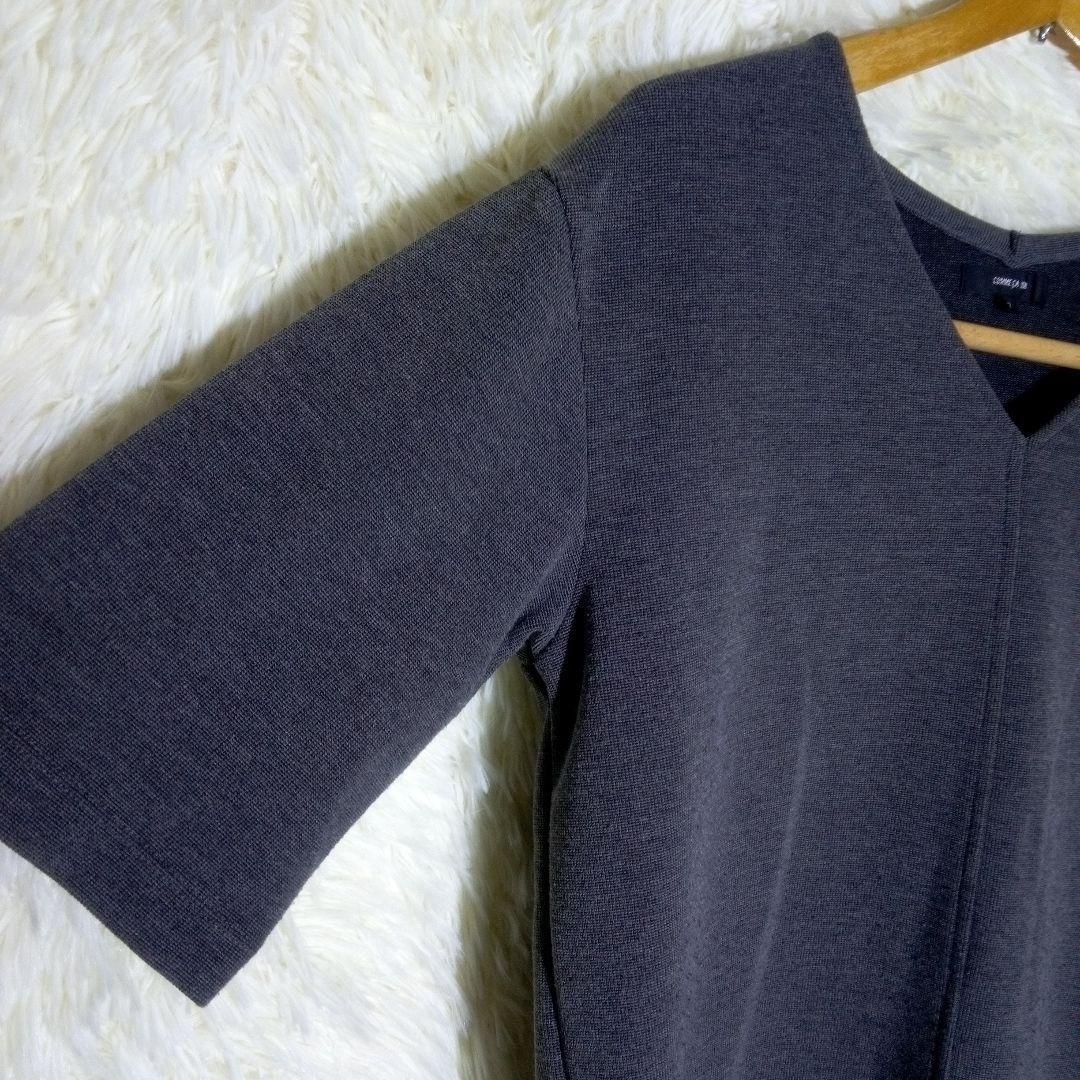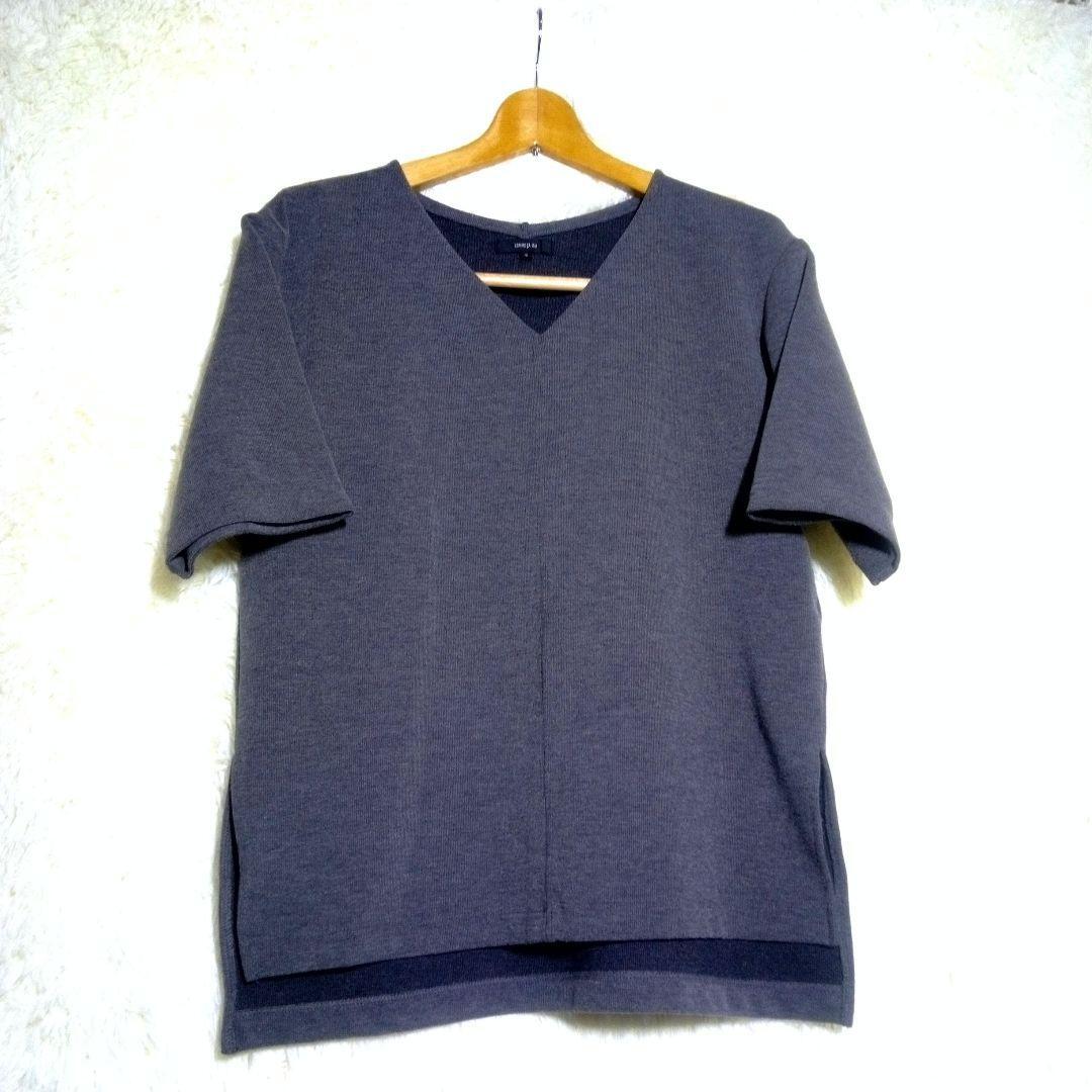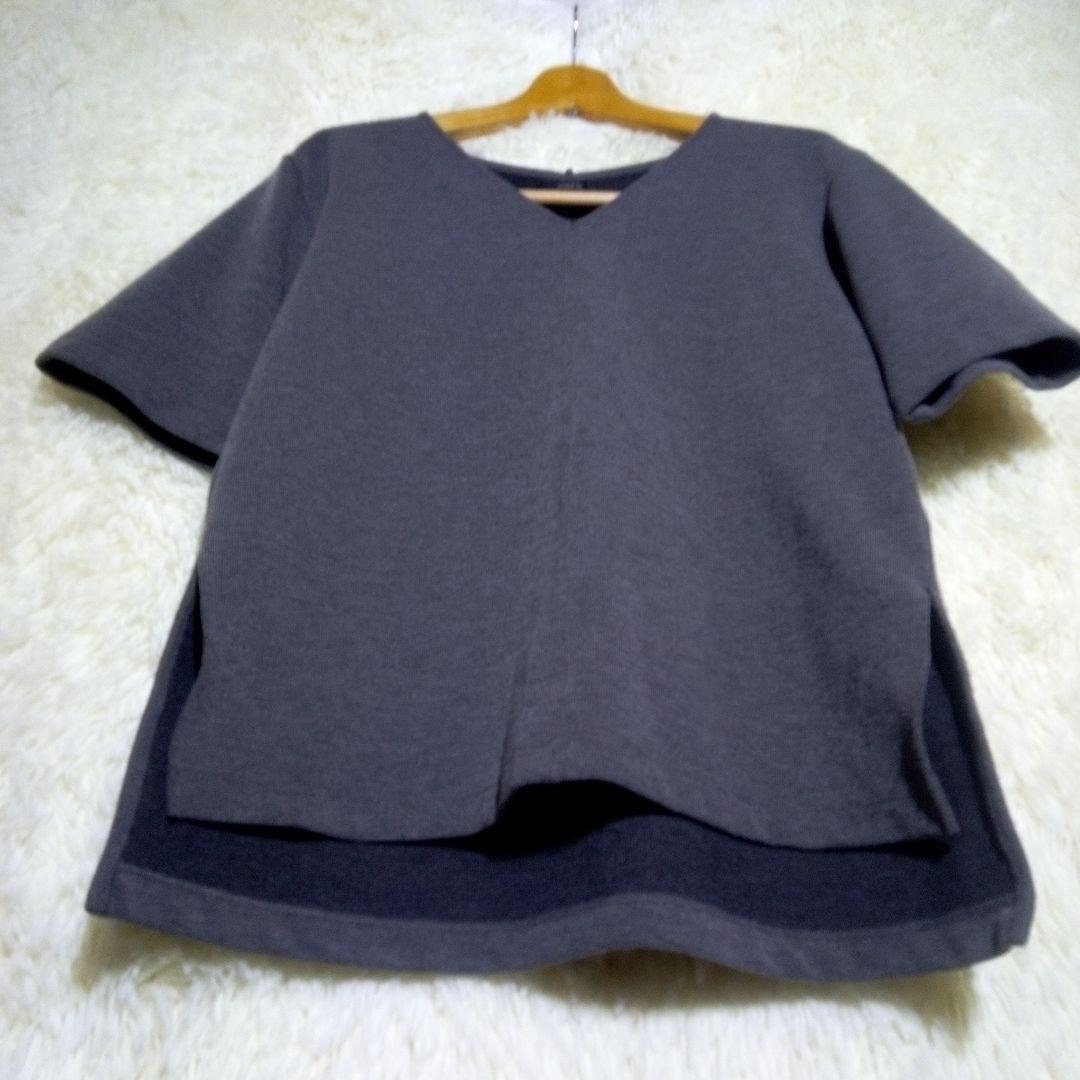 シンプルなダークグレーのVネック半袖Tシャツカットソー、裾に切り替えデザインが特徴。