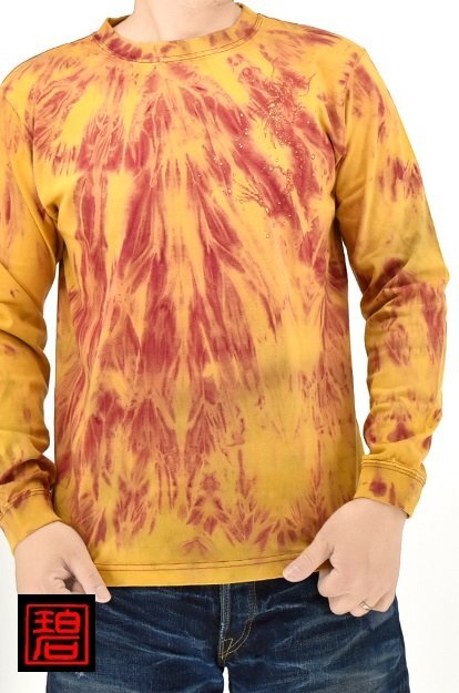 この道40年以上の「ぬれ描き友禅作家・碧三」が魅せる上品で繊細さが特徴の碧(あお)より「金龍 籠抜染ロングTシャツ」のご紹介です。 ボディーにムラ染め風の加工を施した長袖Tシャツに手描きを組み合わせました。 フロント左身頃には金の龍をデザイン。 染めと手描きの組み合わせが絶妙な仕上がりとなっております。 ボディーには、綿100%のさらりとした肌触りのTシャツ生地を採用。 袖にはリブを縫い付け、野暮ったさを軽減しました。 | ||||||||||||||||
