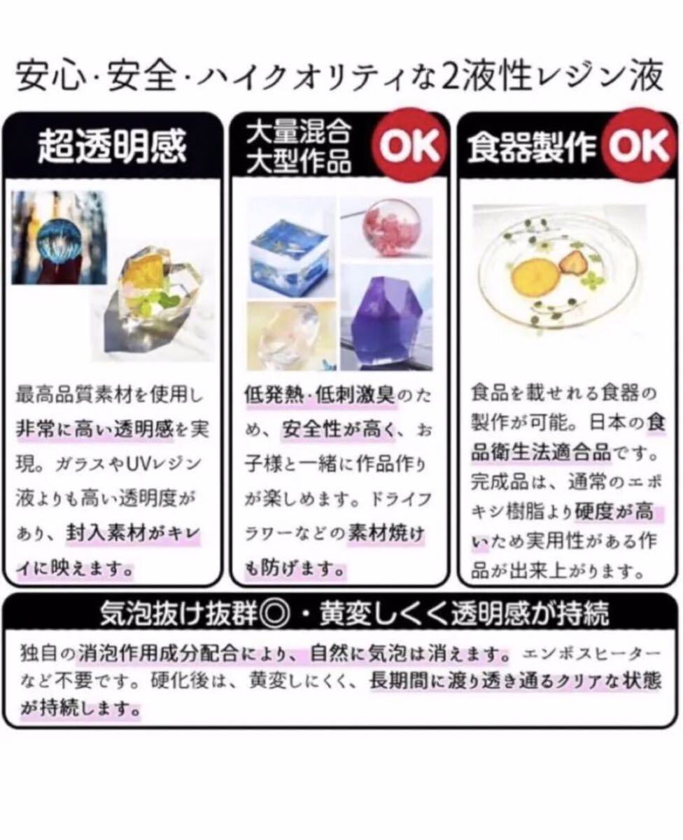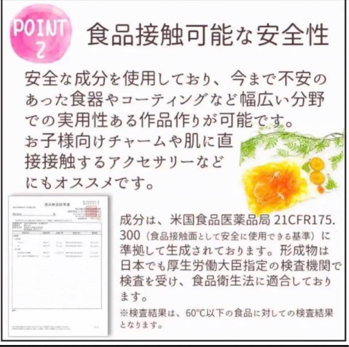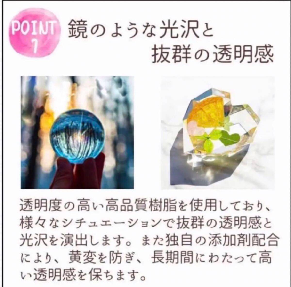 ①レジン液の透明感を活かし ガラスのような透明感、黄変しにくくとってもクリア♪ 着色剤との相性も良く、発色はとっても鮮やか! 封入素材もくっきりキレイに見えるほどの高透明度。 また、時間がたっても黄変しにくいので安心です♪