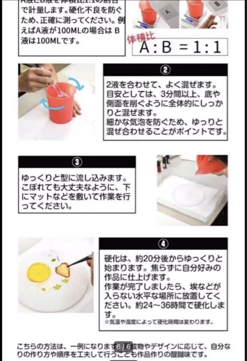 ②工具不要・気泡抜けやすい 1:1の混合容量比は操作が簡単です。同量の樹脂と硬化剤は同時に容器に添加し、気泡のない状態まで攪拌し、金型に注ぐ。エポキシ樹脂は自然硬化タイプで、紫外線当たる必要はありません。あなたはDIYの喜びを感じすることができます。