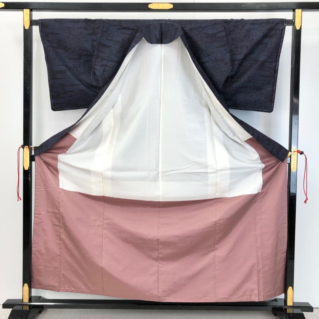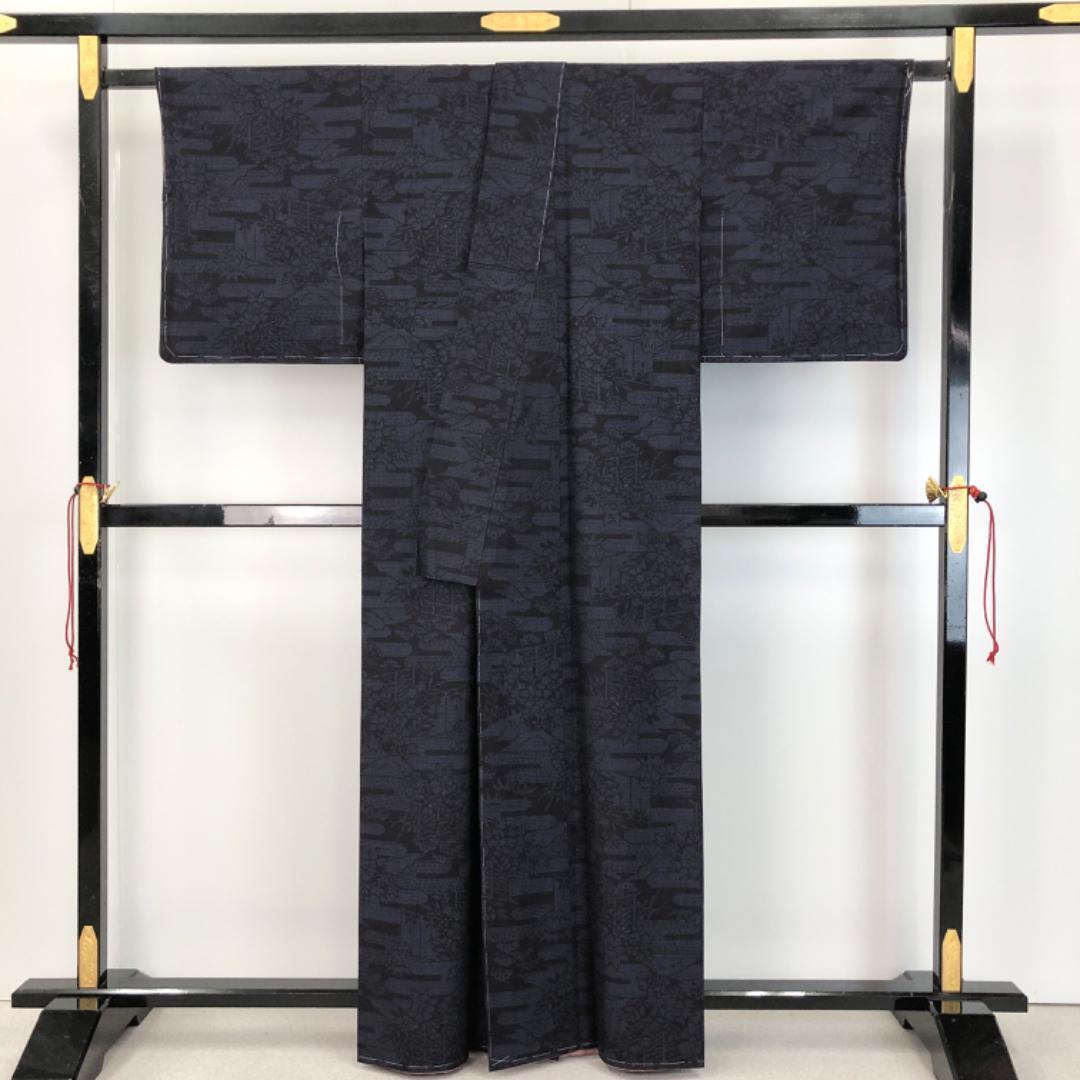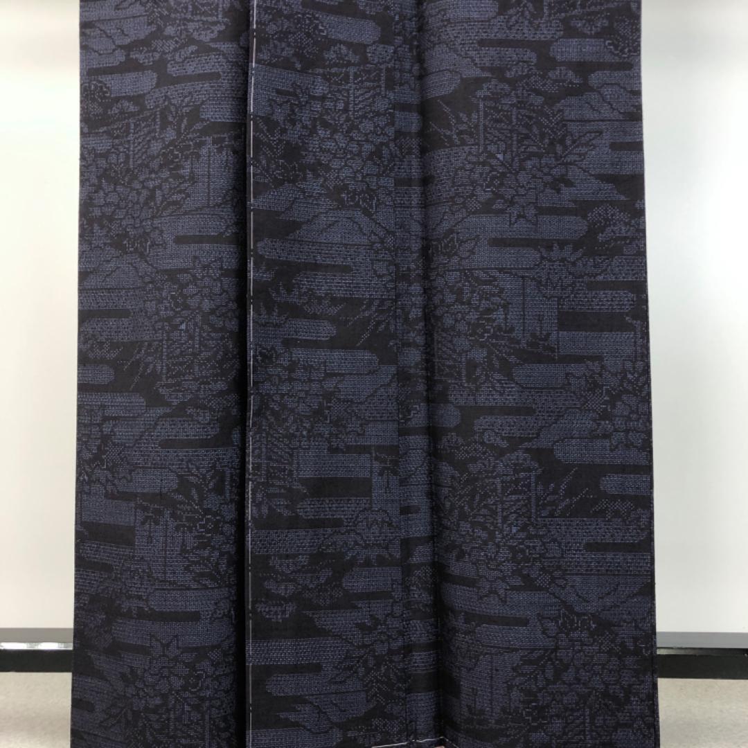 濃藍色のお色味にエ霞に花柄模様がデザインされた雰囲気の良い素敵な柄裄のお品でございます。