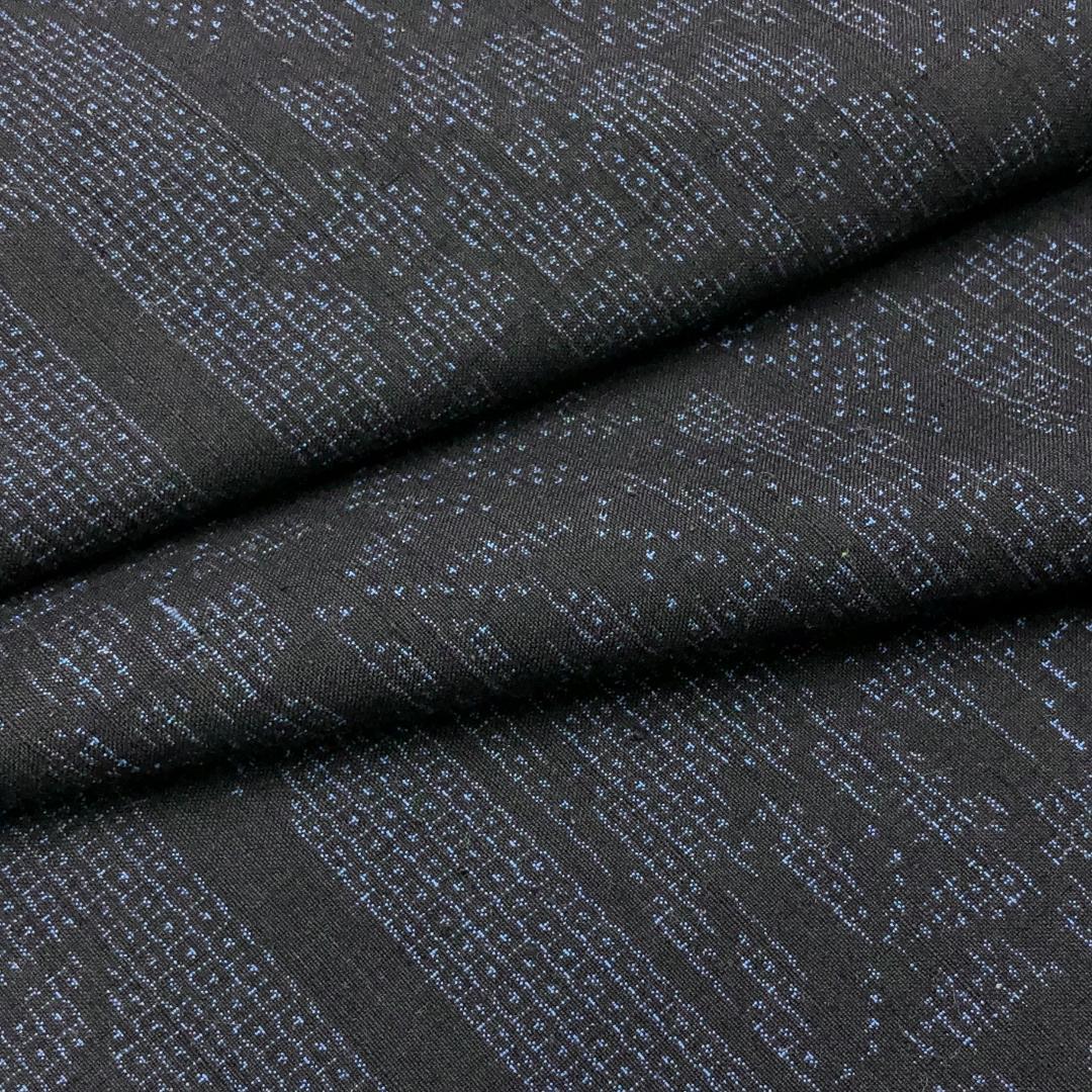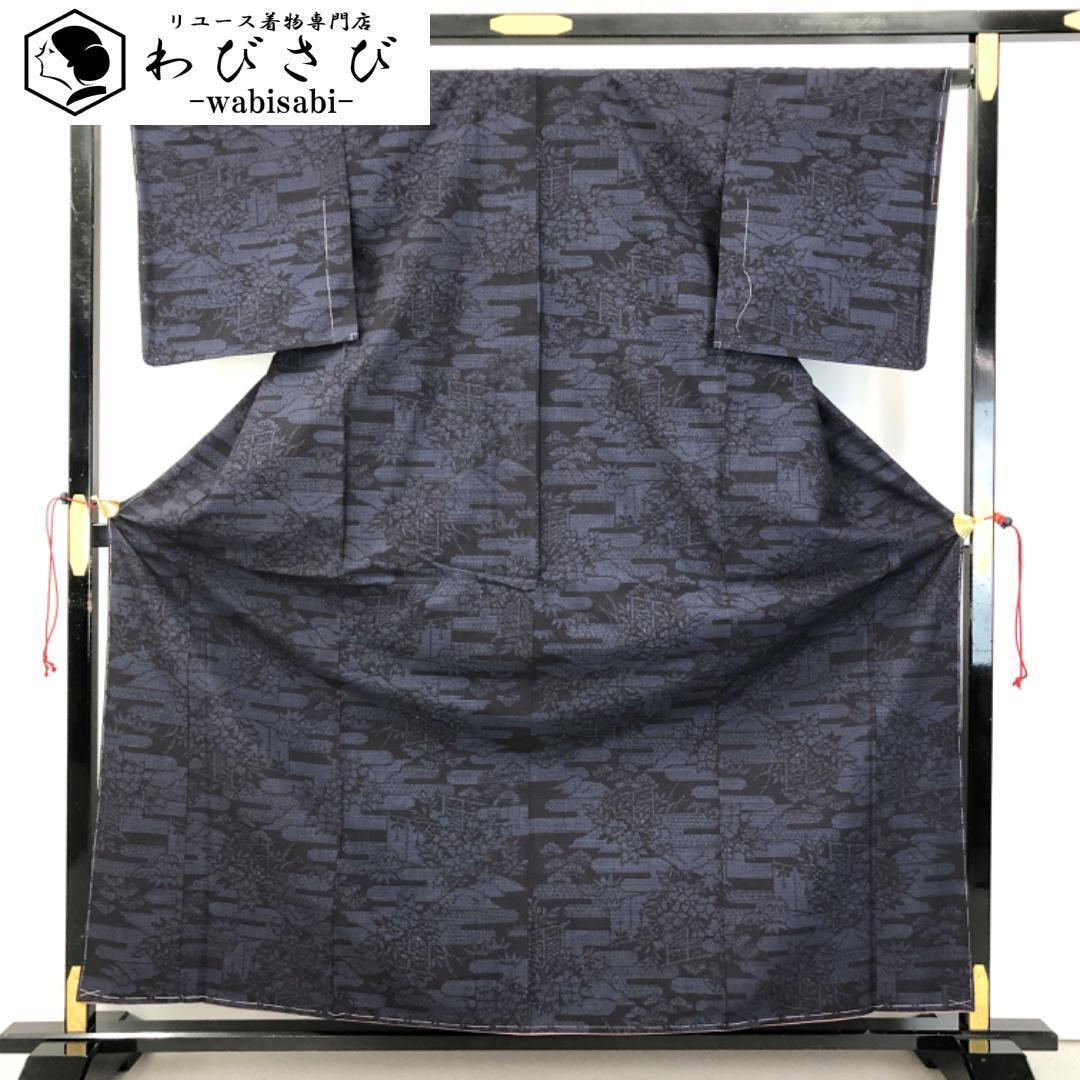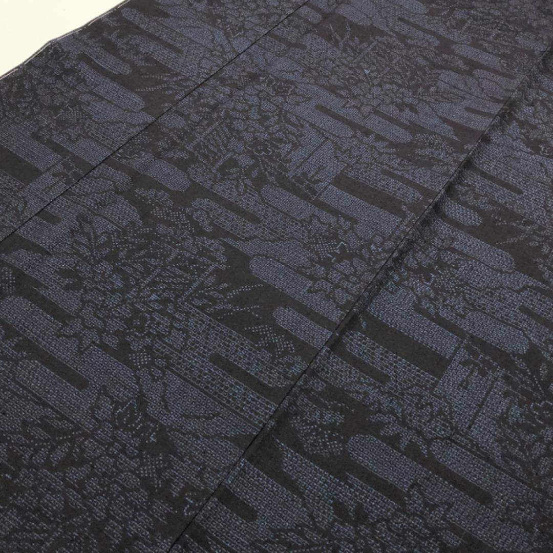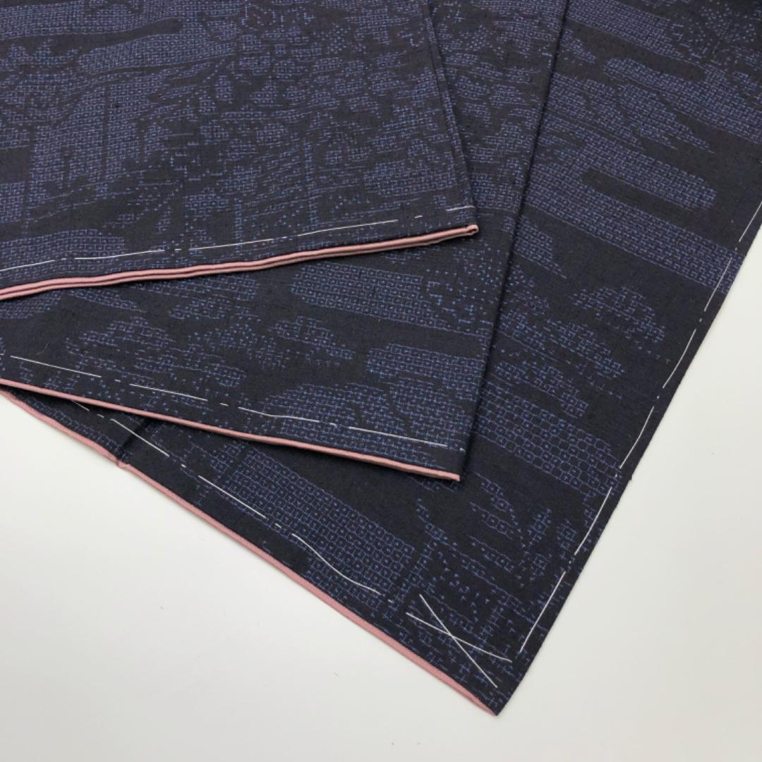 濃藍色のお色味にエ霞に花柄模様がデザインされた雰囲気の良い素敵な柄裄のお品でございます。