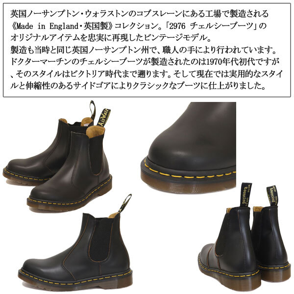 | スペック | 「2976 チェルシーブーツ」のオリジナルアイテムを忠実に再現したビンテージモデル。製造も当時と同じ英国ノーサンプトン州で、職人の手により行われています。シンボルであるイエローウェルトステッチ、AirWairデザインのヒールループ、エアクッションソールなど全てを搭載し、シンプルかつ合わせやすいデザイン。 |