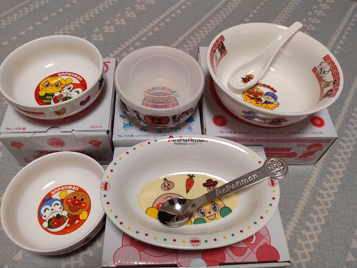 Go アンパンマン食器類4点セット ラーメンどんぶり(レンゲ付き)シチューカレー皿(スプーン付き)蓋付小皿 小ボウル(2個セット)全て未使用品です。