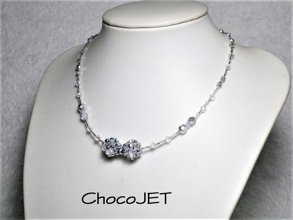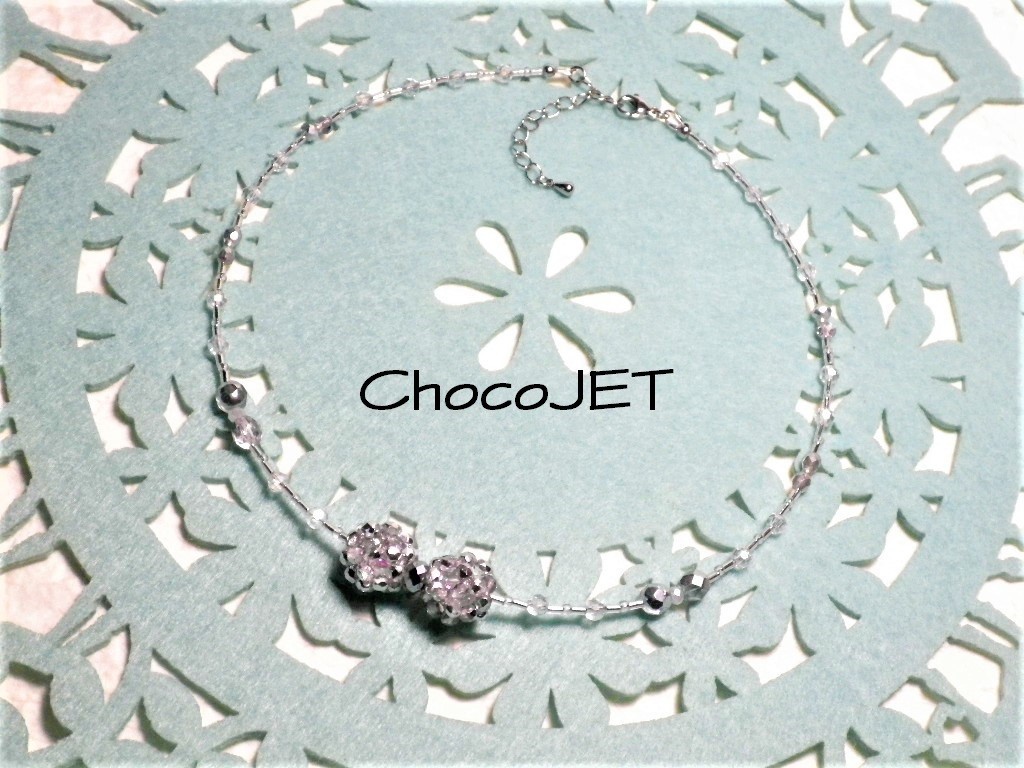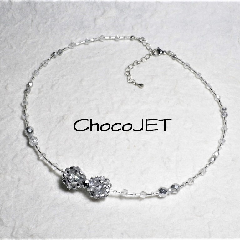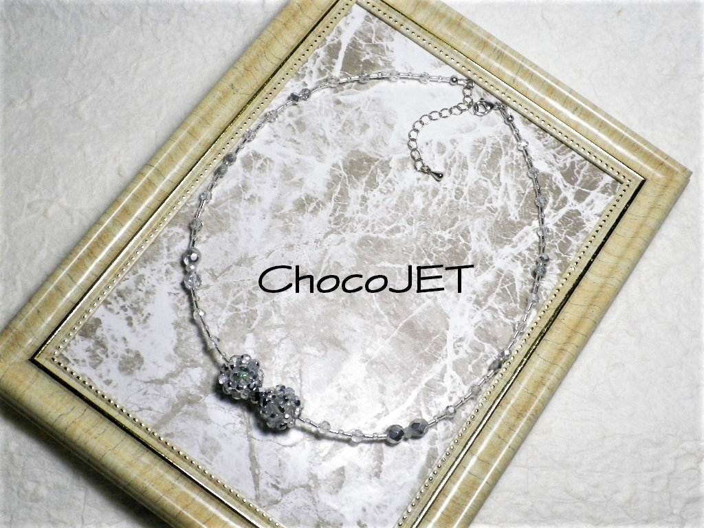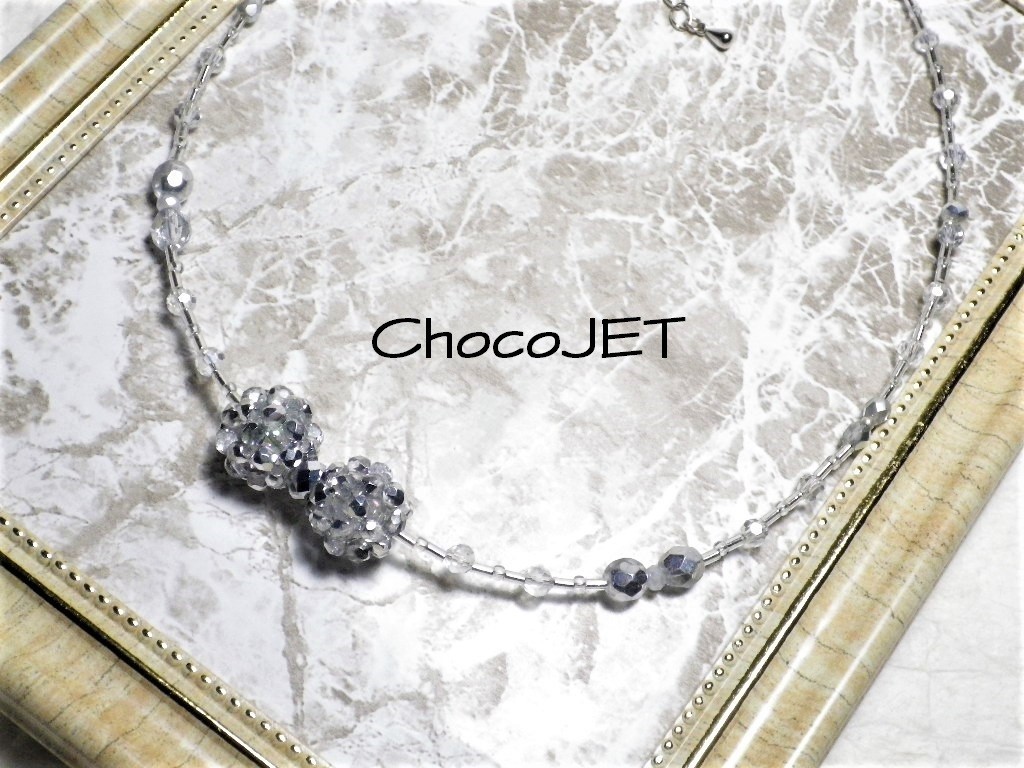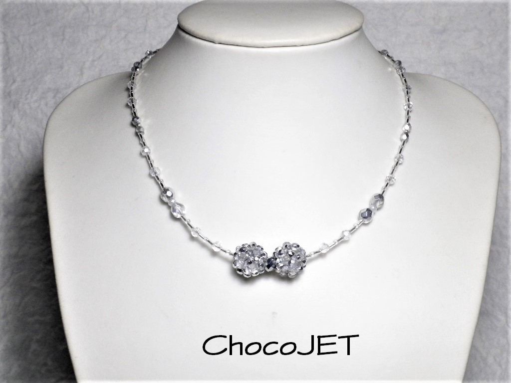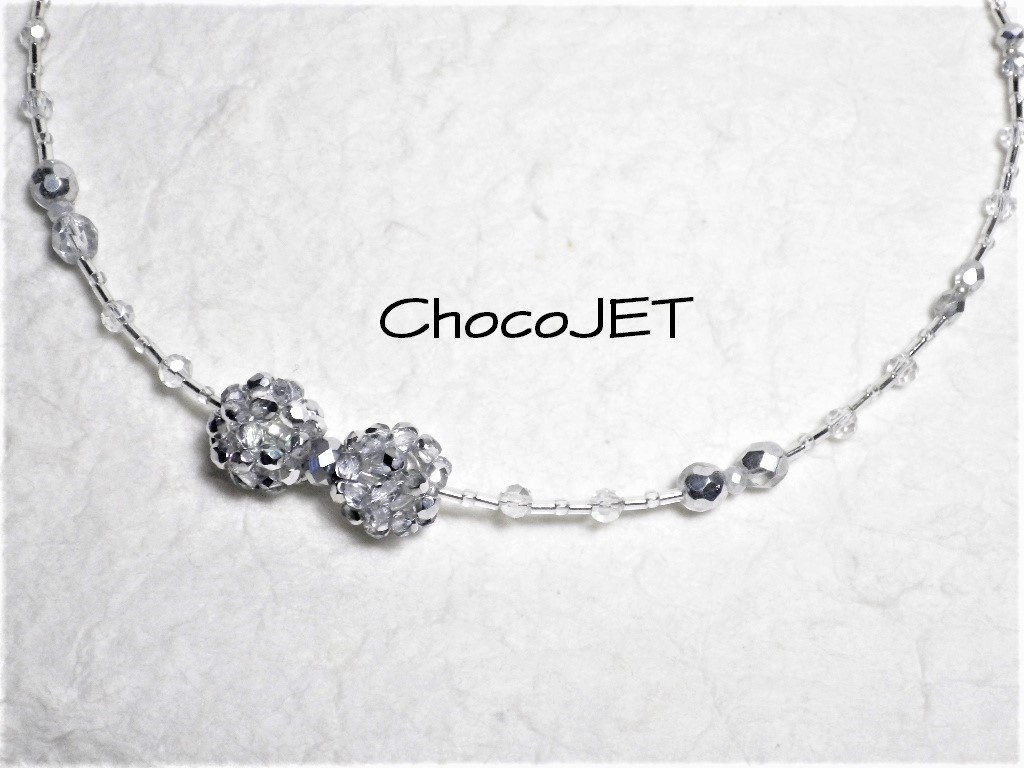 チェコビーズボール2個とシードビーズ、グラスビーズボールとガラスカットビーズ、竹ビーズ使用のシルバーカラーのキラキラと輝く、ビーズボール・リボンネックレスです。