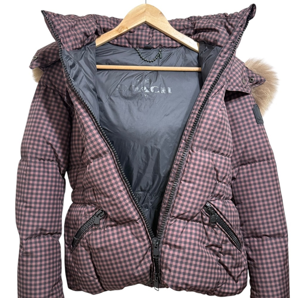 美品 COACH コーチ チェック柄 ファー付き ダウンジャケット ブルゾン XS ブラウン×ブラック