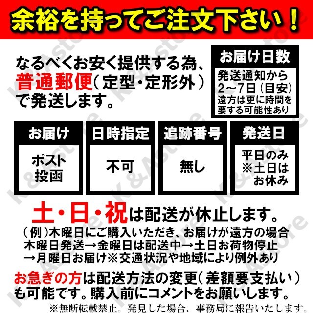 ・お安く提供するため、日本郵便の普通郵便にてお届けいたします。他の配送方法と比較してお時間を要します。予めご了承下さい。詳細は商品画像をご確認下さい。