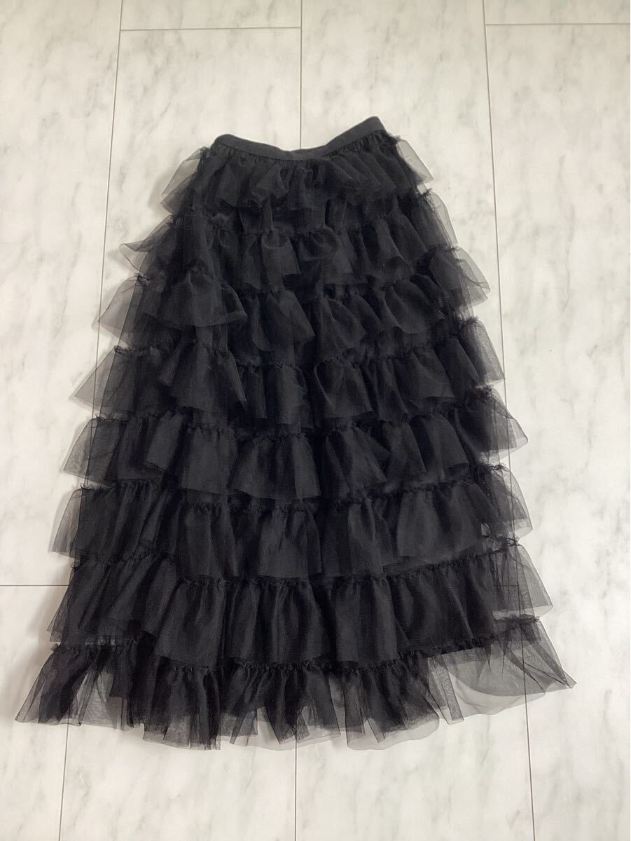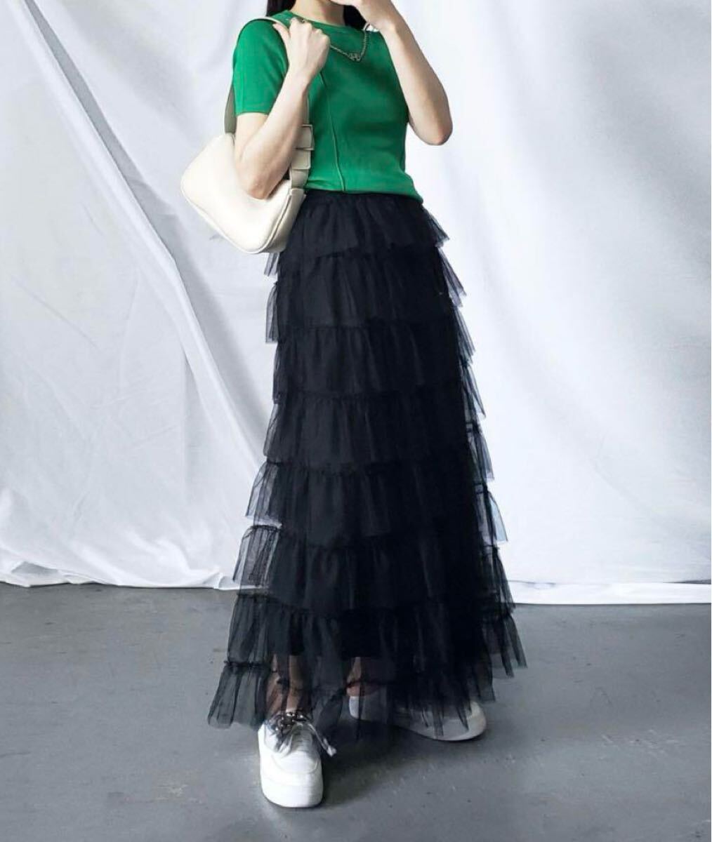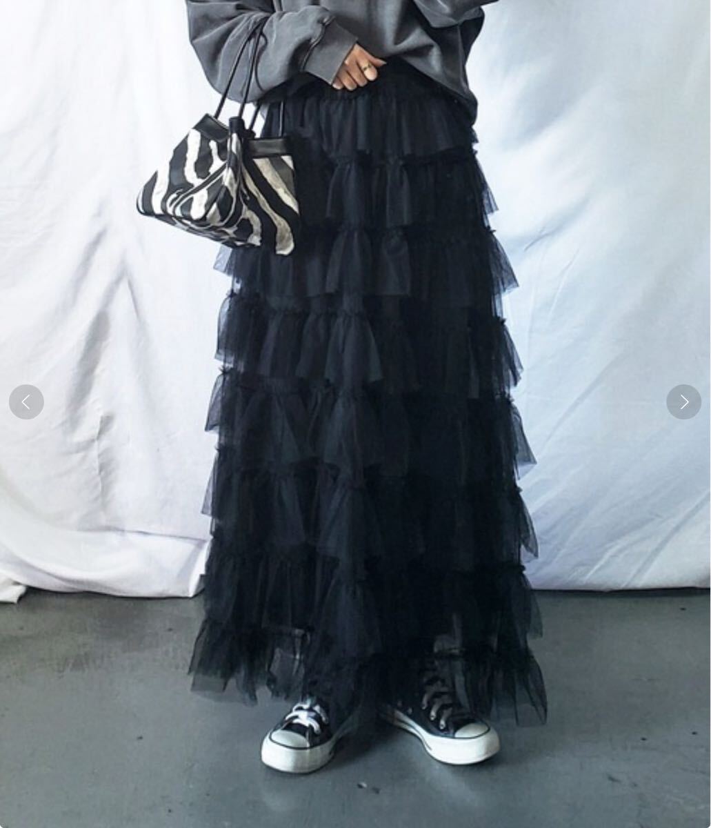 たっぷりボリュームの表情豊かなフリルチュールスカート。