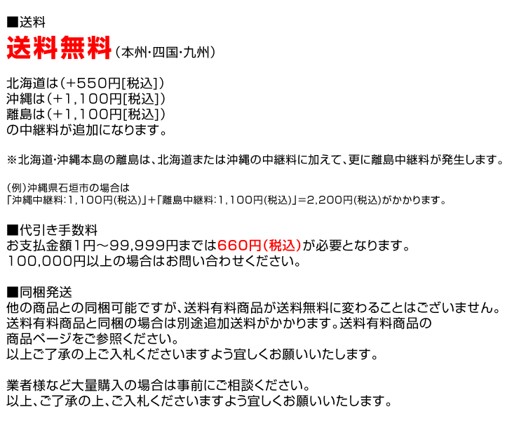 ▼ 商品に関するお問い合わせはこちら ■対応時間 10:00~15:00 土日祝日休業 ※商品に関するお問い合わせや初期不良等のご連絡はやり取りの履歴を残すために、 お手数ではございますが、必ず下記のメールアドレスにご連絡ください。 okuraya_san_ys@yahoo.co.jp ▼ 営業日・支払い方法・発送・返品・交換・保証に関して ※必ずお読みください 営業日・支払い方法・お届けについて・返品・交換・保証に関する件は、以下のページにて詳しく記載しております。 営業日掲載ページはこちら 営業日カレンダー掲載ページ 支払い方法・お届けについて・返品・交換・保証に関する掲載ページはこちら お買い物ガイド詳細ページ プライバシーポリシーに関する掲載ページはこちら プライバシーポリシー記載ページ ▼ 質問が多かった即決落札について 即決で落札する方法 即決で落札するには ├PC版の場合は、商品画像右の「今すぐ落札する」をクリックします。 └スマホ版の場合は、(1)「入札する」をタップします→(2)最高入札額記入欄に、即決の金額(税抜)をご記入頂ければ即決できます。 入札→即決落札した場合の履歴に関して ご入札頂いているYahoo_IDで即決価格で再度ご落札して頂ければ、前の入札の履歴は残りますが前の分はキャンセルとなり、即決価格のみでのご落札となります。重複しませんのでご安心ください。 ▼ オークションに関して 入札後の各種確認メールについて 当店からの受注確認メール・入金確認メール・発送確認メールが「迷惑メールフォルダ」に自動で振り分ける場合がございます。 「フォルダを空にする」前にメールが届いているか一度ご確認ください。 ご落札の際は、以下3つの当店メールアドレスが届くように受信設定をお願いいたします。 okuraya_san_ys@yahoo.co.jp okuraya_san@yahoo.co.jp 当店からの各種確認メールは、オーダーフォームに登録のメールアドレス宛に送信されます。 取引方法 手渡しでの直接取引には対応できません。物流業務を委託していますので、 お近くにお住まいの方でも商品のお受け取りに来ていただくことはできません。 在庫について 当社では、卸販売など各方面でも商品を同時販売しております。 在庫情報は随時更新(新規出品の停止、個数少数での出品、出品取り消しなど)させて頂いておりますが、ご落札頂いた際に時間差などで売り切れになる場合もございます。 予めご了承ください。 商品の価格について 当サイトでは、正確な価格表示に努めておりますが、万が一表示価格やご注文商品の金額に誤りがあった場合、 誤表記を理由にご注文を取り消させていただくことがございます。 取り消しに際し、お客様にはメールにて販売価格をお知らせしご注文を継続されるか否かのご確認をさせていただきます。 なお、これによりお客様にご不便やご迷惑をおかけした場合でも、 直接的または間接的な損害についての補償は致しかねますことを、何卒ご理解のほどお願い申し上げます。 キャンセル お客様都合でのキャンセルはお受けできません。 やむを得ぬ事情により商品発送後にキャンセルをされる場合には、 キャンセル料として返送時に発生した実経費(送料)をお客様側にご負担いただきますので予めご了承ください。 落札後3日以内にご連絡が取り合えないお客様についてはやむを得ずキャンセル処理をさせていただく場合もあります。 交換返品返金について お客様都合での、交換・返品・返金は一切対応できません。 評価について 著しく評価の悪い方の入札はご遠慮願います。 領収書発行について 商品代引きご利用の場合は、伝票が領収書となりますので、別途領収書の発行はできません。 領収書発行希望のお客様は入札後、オーダーフォーム要望欄に必ず「領収書発行希望」をご記入の上ご連絡ください。 |