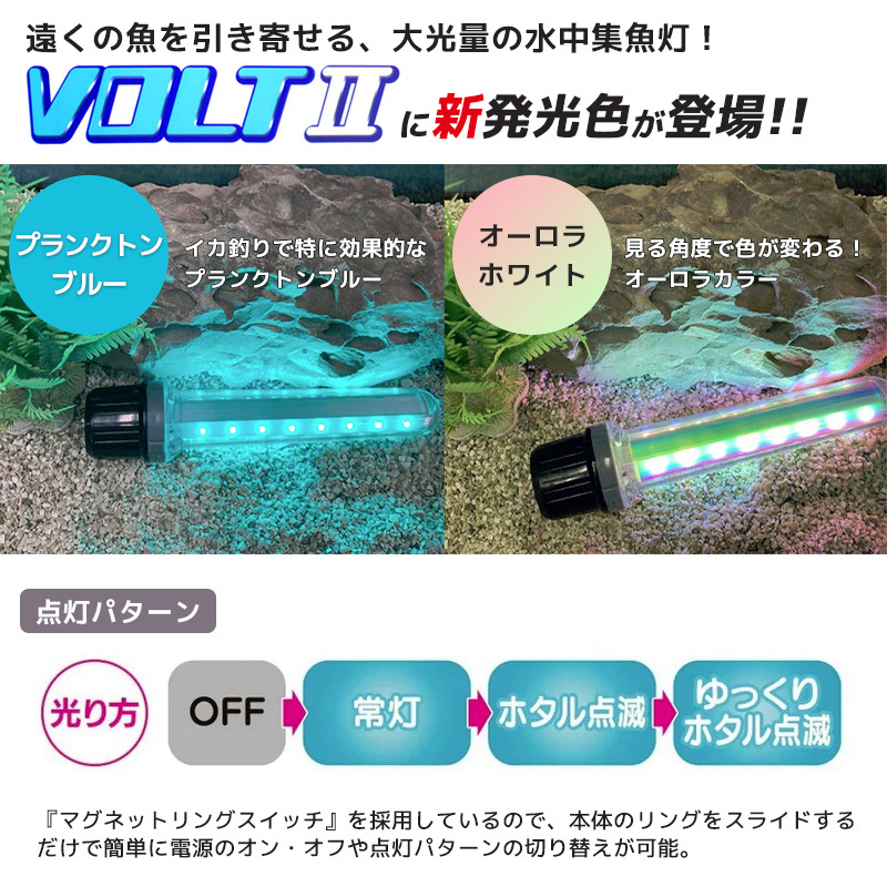商品名 | ボルトツー VOLT2 新発光色 オーロラホワイト LUMICA 高輝度LED24灯搭載 釣り 耐水圧30m 48×218mm 水中集魚灯 | ||||||||||